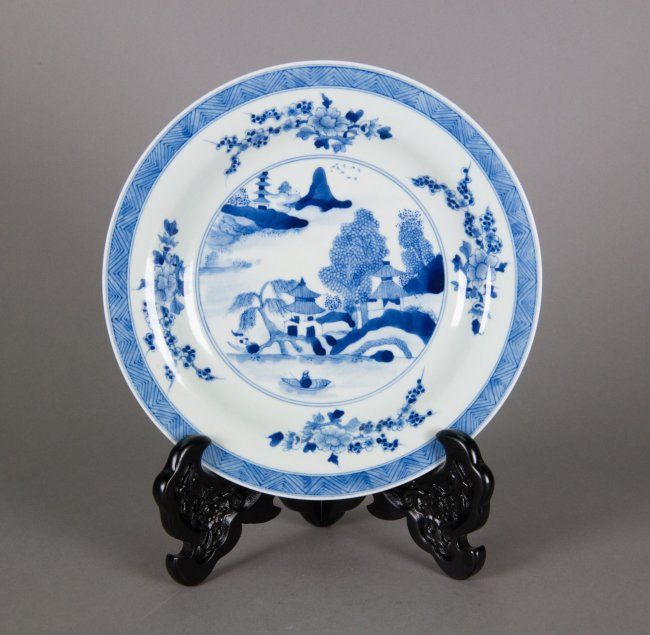 Chinese export blue and white plate; the centre featuring a landscape scene by the sea; the cavetto decorated with prunus blossoms; D: 22.5 cm, 460 grams