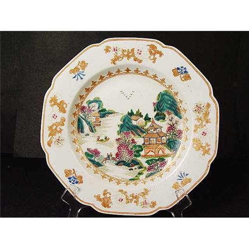 Chinese Export; Chinese Export Famille Rose Plate, decorated in the tyical Asian village scene, late 19th Century. Dimension: 9 Inch Diameter. $10 for Shipping and Handling within the US. At cost World wide. Excellent condition with minimum gilt loss. No chips. No crack. No restoration