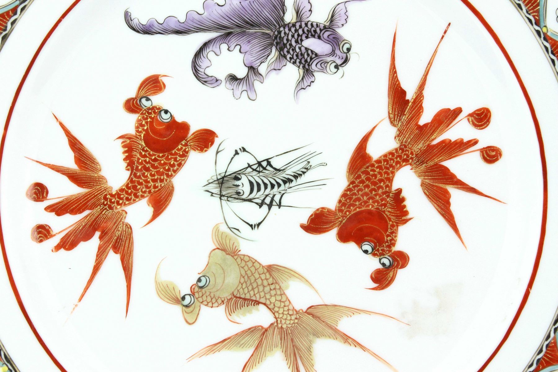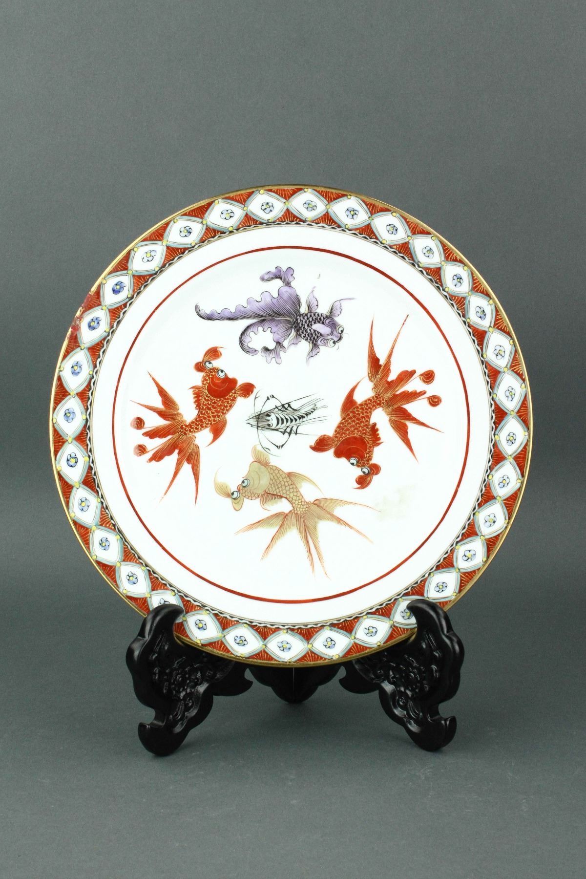 Chinese export porcelain dish; featuring paintings of gold fishes on centre; Qing period; chipped rim; H: 2 cm, D: 26 cm, 550 grams