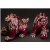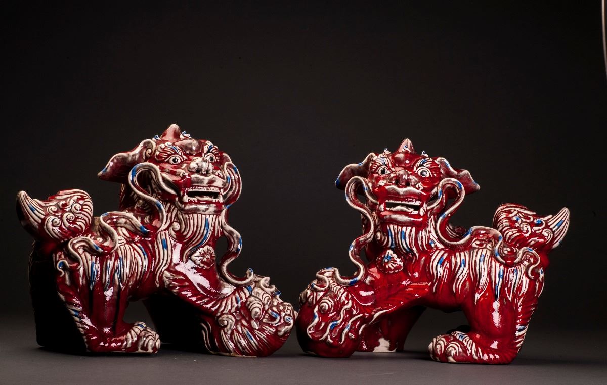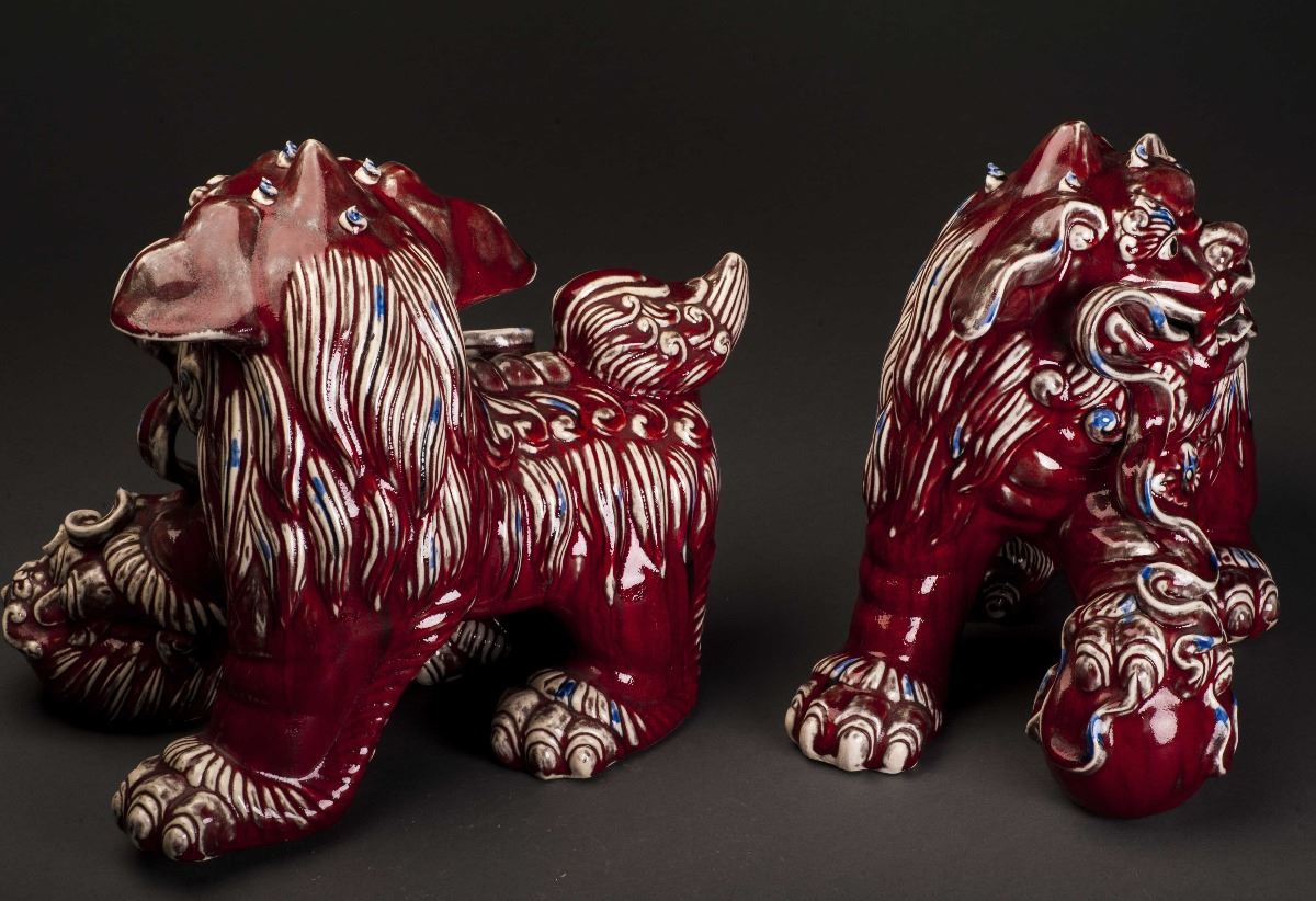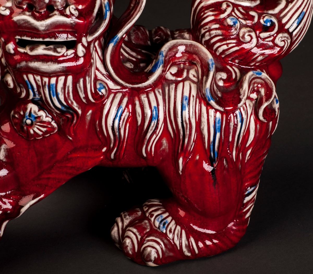 A Pair Of Kiln Glazed Porcelain Lions, With The Alternative Tone Of Red Throughout. Face Vividly Expressed, With The Delicate Design Of Chasing The Ball.