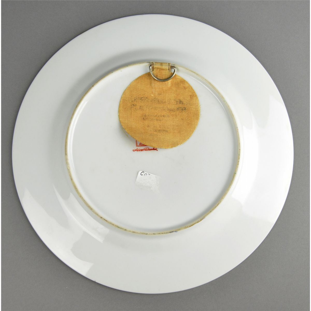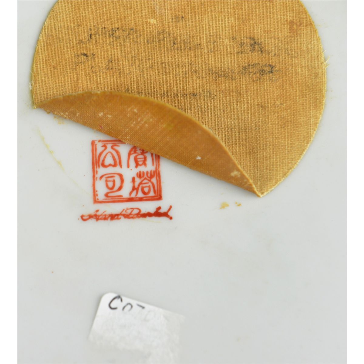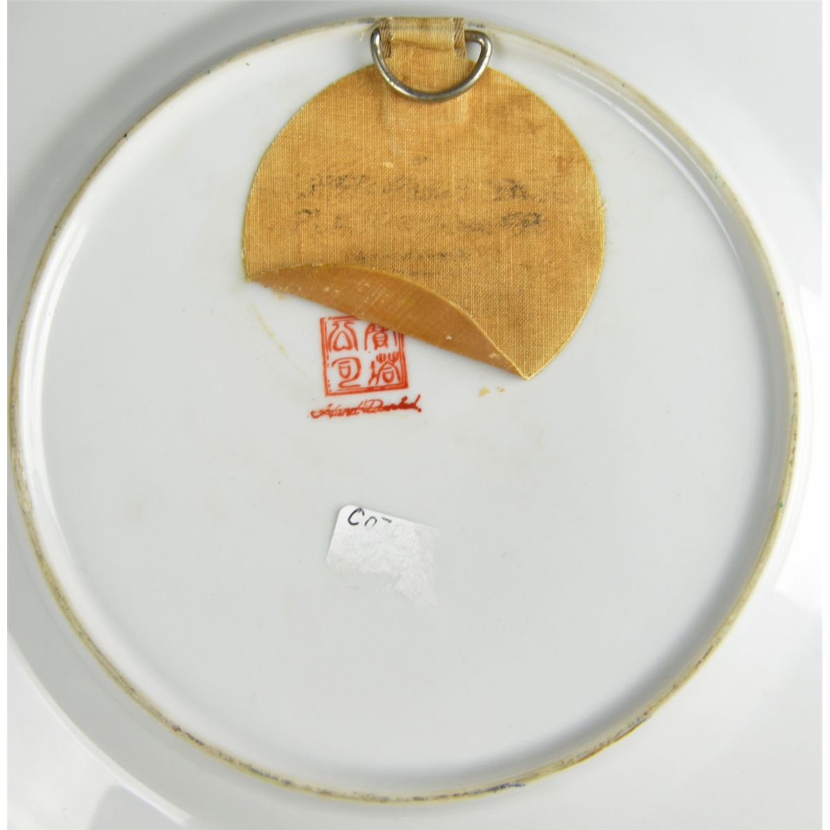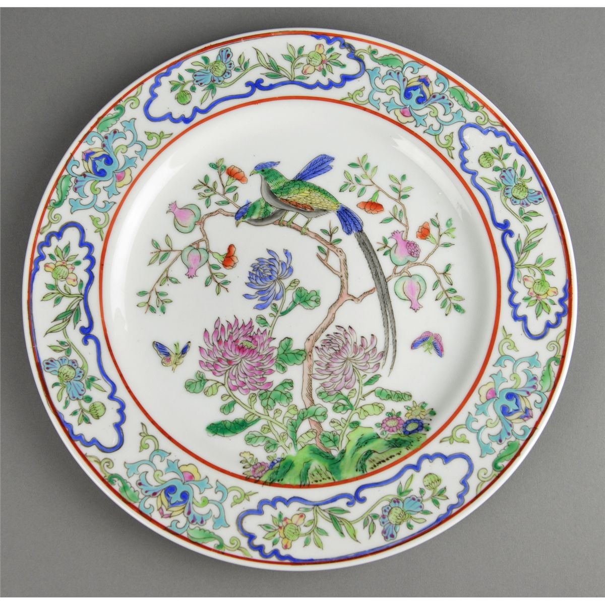 Chinese enameled porcelain plate; featuring birds, peaches, and flowers; four-character Mark on base; D: 26.5 cm