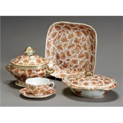 Each decorated in orange-red with gilt highlights. 25 pieces. Restorations to rim of soup plates; chip to rim of one bread and butter plate.