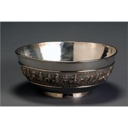 The circular bowl with a chased and embossed applied band decorated with an equestrian scene. Impressed with maker's mark. Dents to surface of bowl.