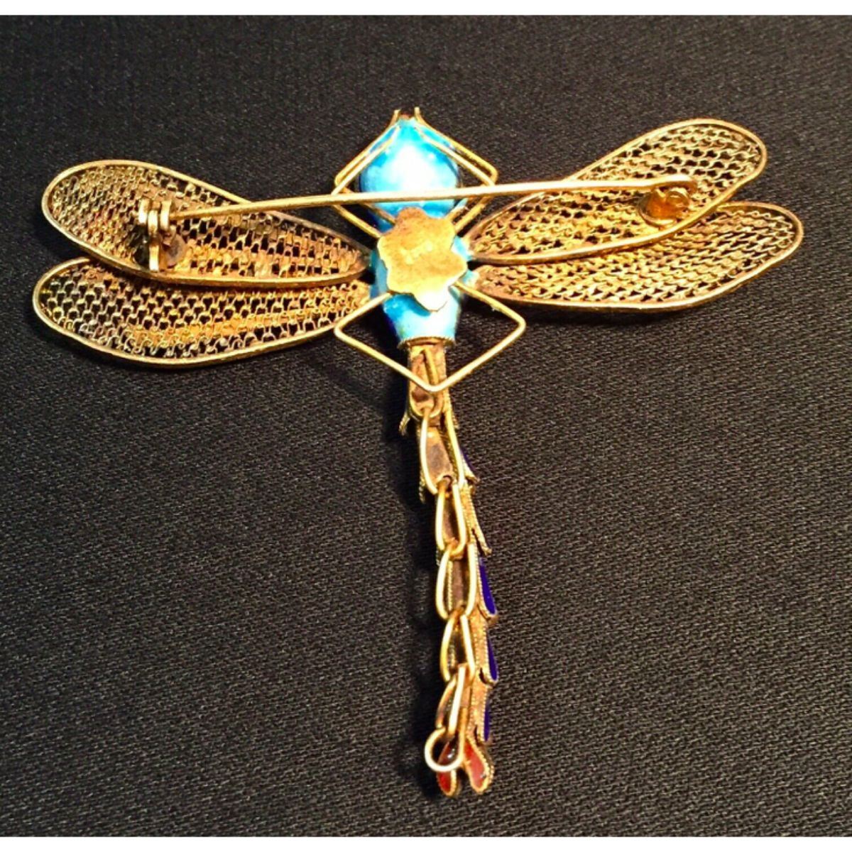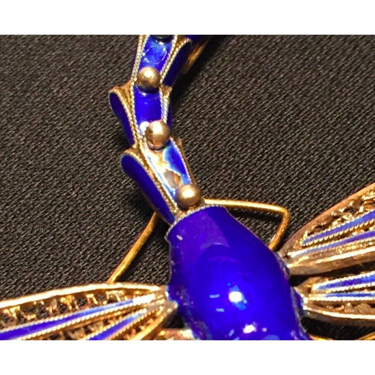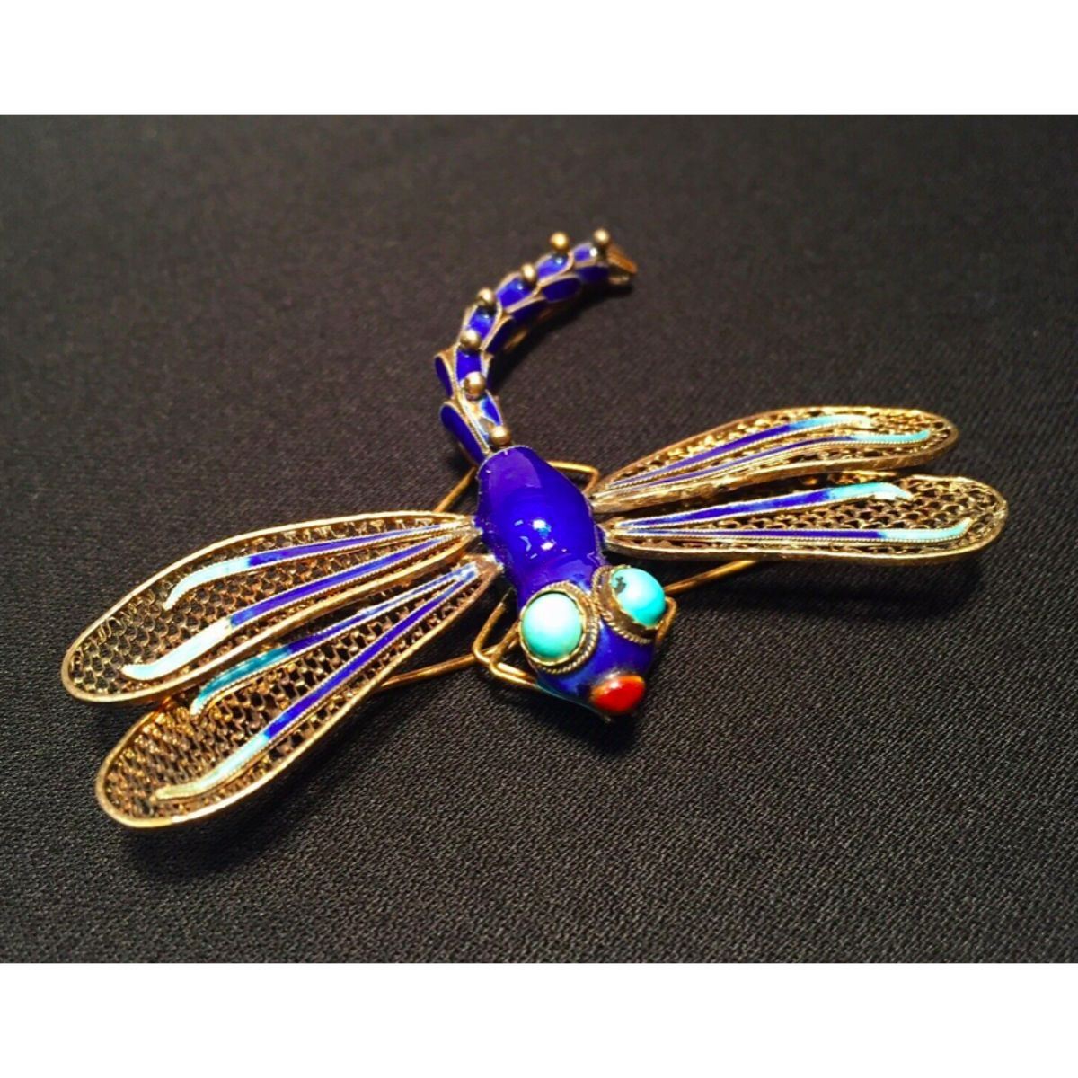 Early 1900's Chinese export sterling silver & vermeil with blue enamel articulated dragonfly brooch with turquoise eyes.Â