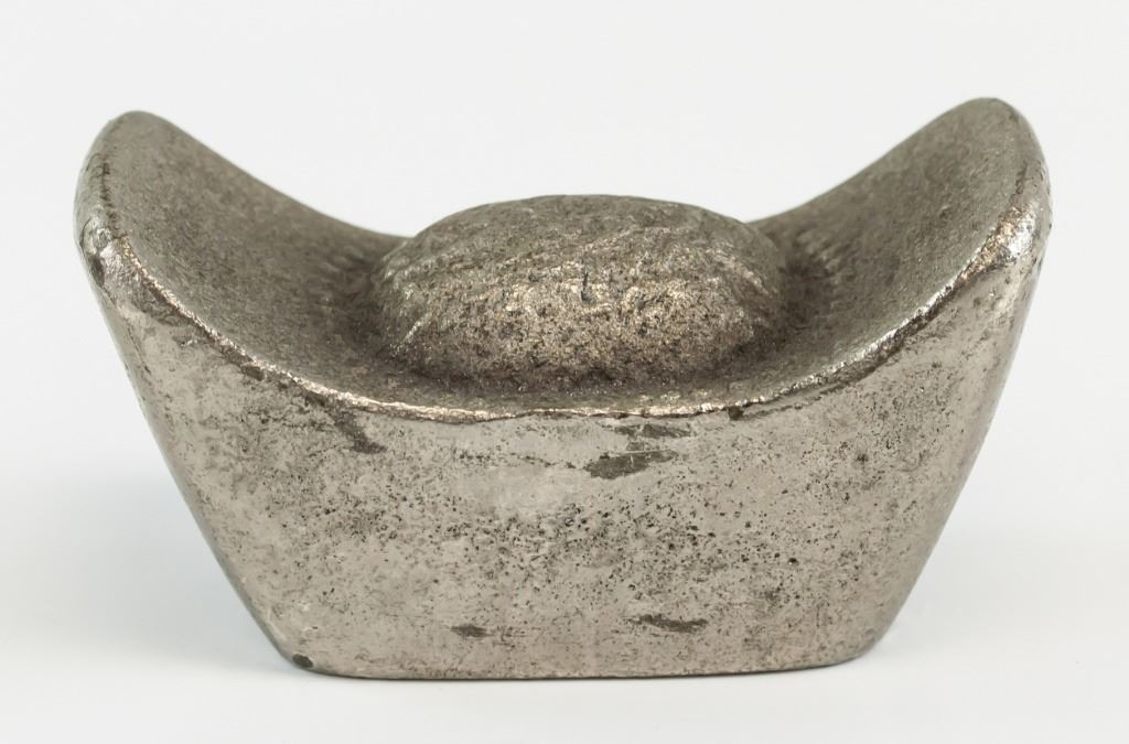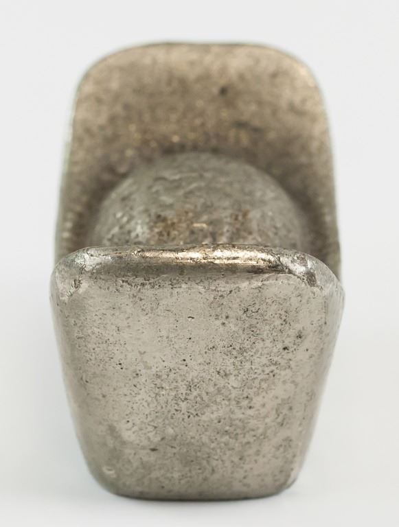Chinese silver-colored ingot. Of extra large size. Guangxu mark on base. W: 10 cm. H: 4 cm. 504 grams.