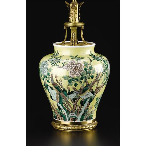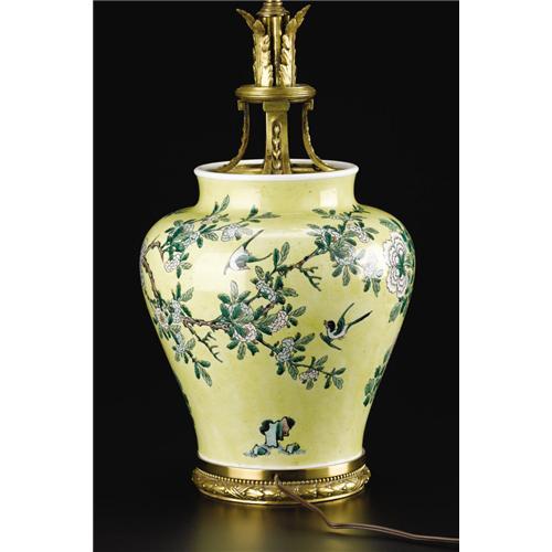 <B>A Chinese Famille Jaune Gilt Bronze Mounted Vase, Fitted as a Table Lamp</B></I><BR><BR>Unknown maker, China/France<BR>Late Nineteenth/Early Twentieth Century<BR>Porcelain, gilt bronze<BR>Unmarked<BR>18 inches high (total)<BR><BR>The baluster-form vase decorated with long-tailed birds in flowering branches in green and brown on a yellow ground, the base and neck fitted with bronze mounts.<BR><BR><BR><BR><b>Shipping:</b> Requires 3rd Party Shipping (<a target="_blank" href="http://www.heritageauctions.com/common/shipping.php">view shipping information</a>)