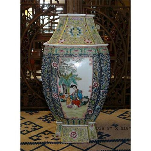 This is an special cross shape famille porcelain vase with nice blue and yellowish green color. Each side has a scenery of mother and the son. It is an enjoyable piece with many things to appreciate. <p>