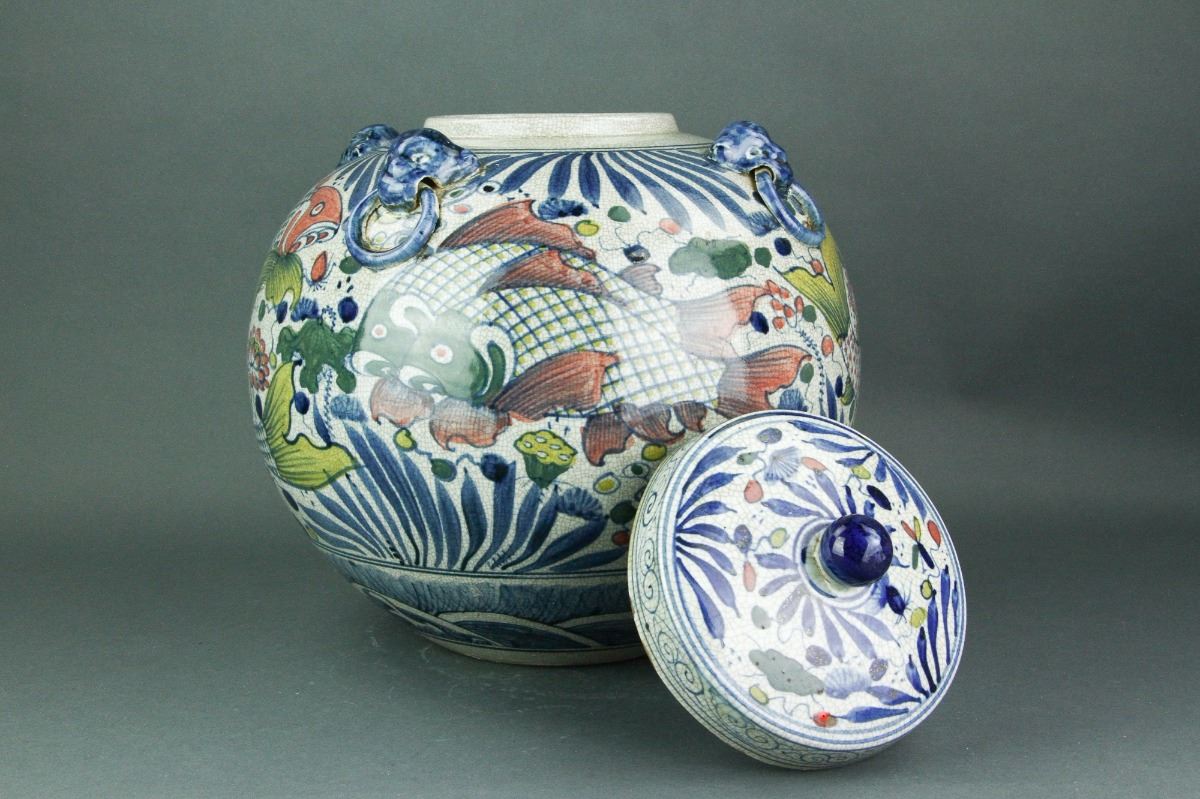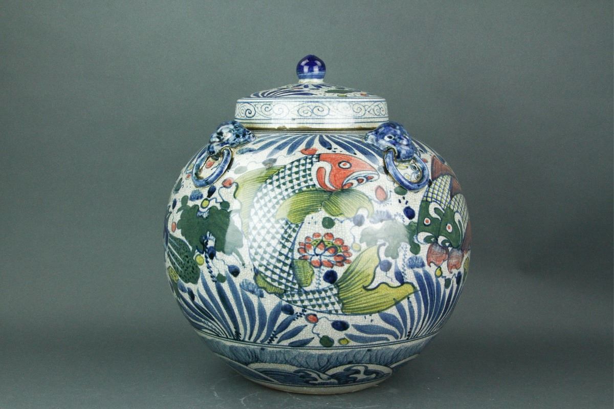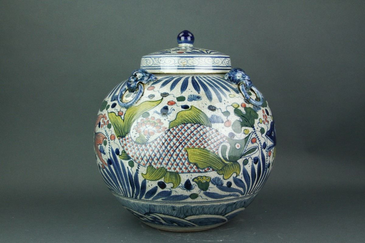 Chinese Famille Rose porcelain jar with cover; of globular body with three faux ring handles on shoulder; featuring carps amongst aquatic plants; H: 38 cm, D: 31 cm, 4913 grams
