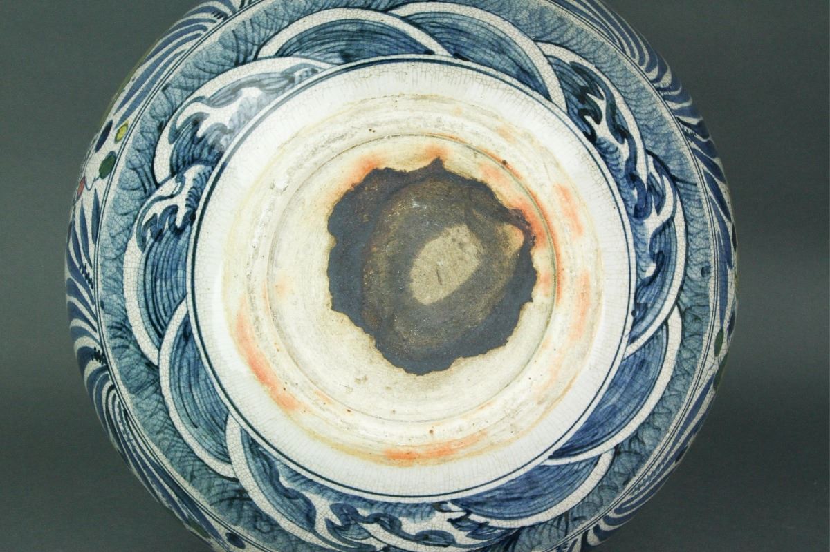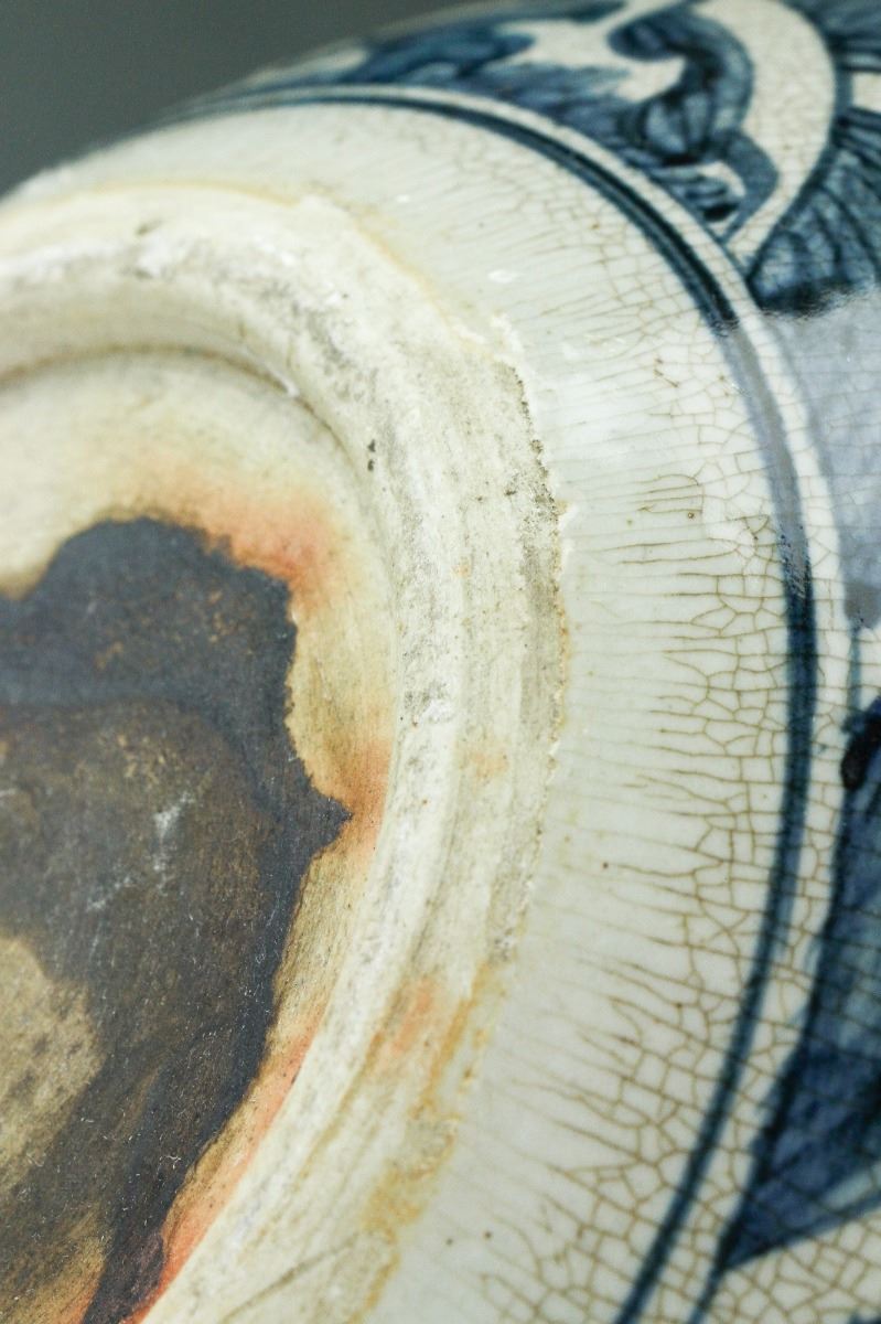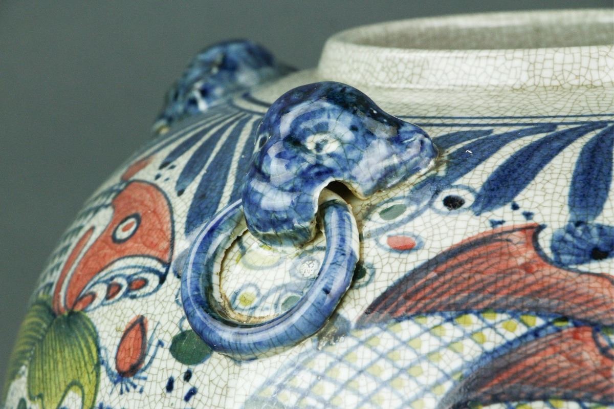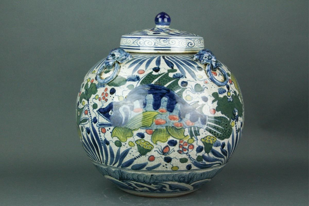 Chinese Famille Rose porcelain jar with cover; of globular body with three faux ring handles on shoulder; featuring carps amongst aquatic plants; H: 38 cm, D: 31 cm, 4913 grams