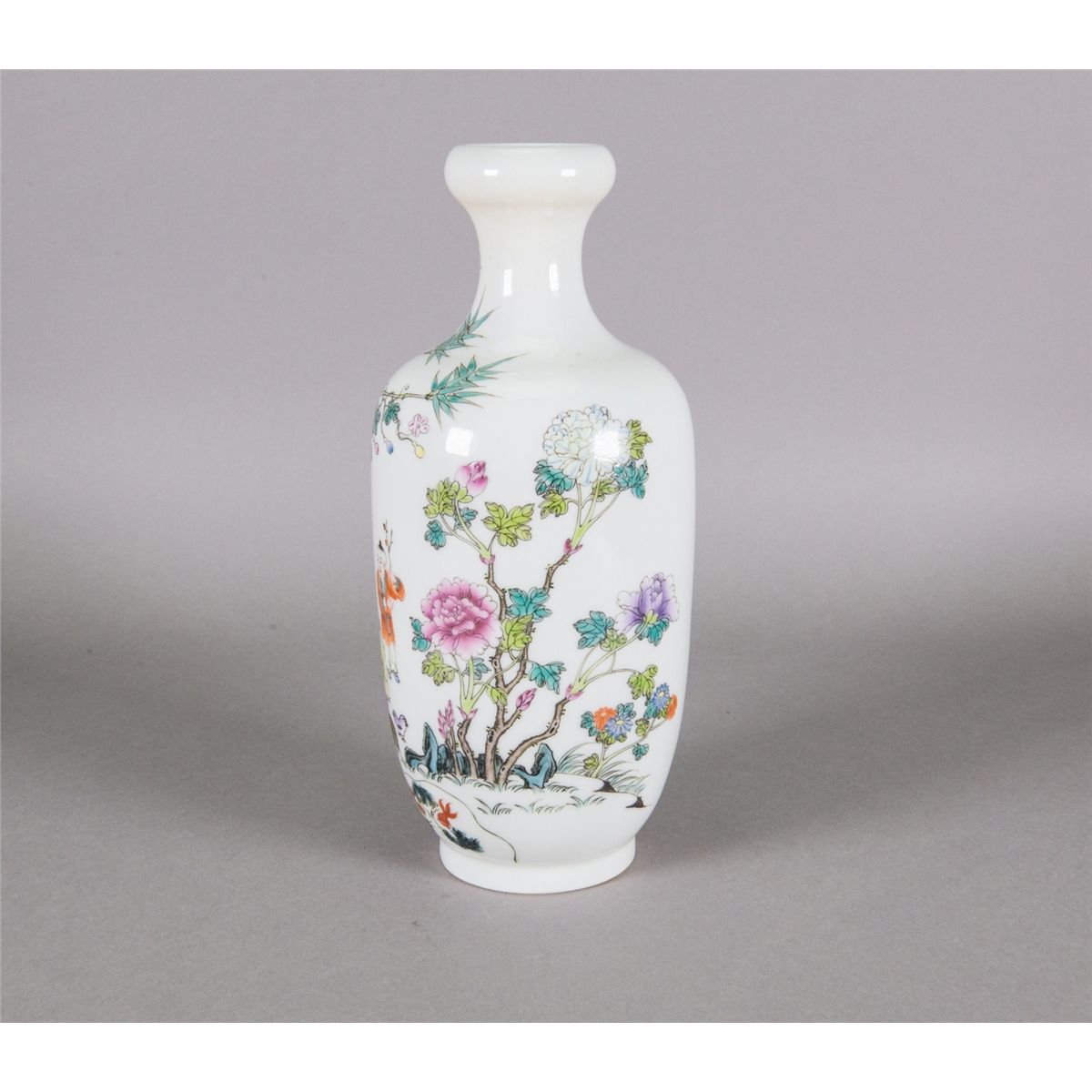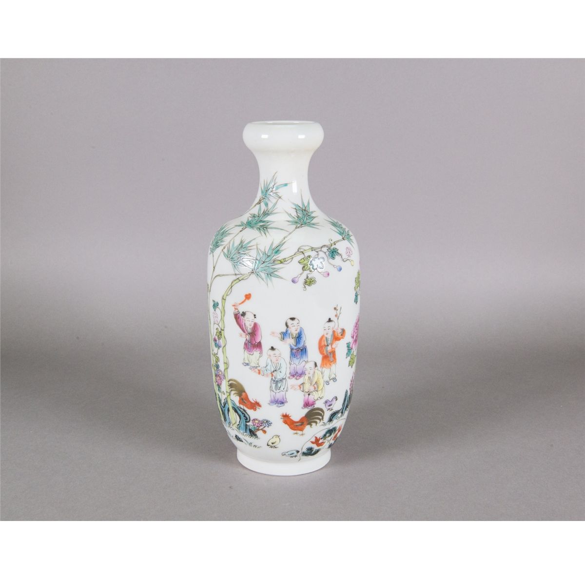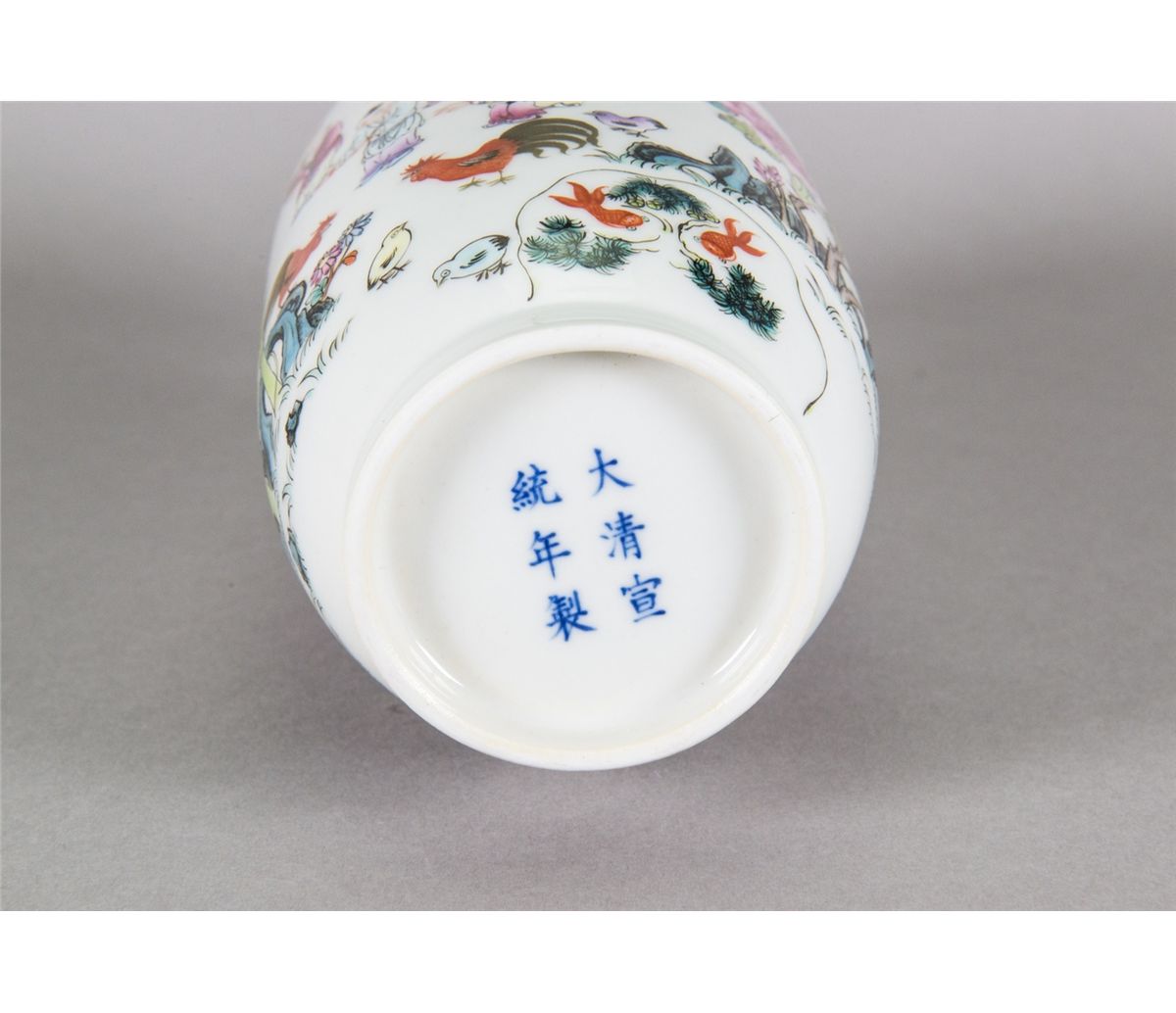 Chinese Famille Rose enameled porcelain garlic vase; featuring garlic form opening; with patterns of peonies on body; six-character Xuantong mark on base; H: 26 cm, W: 13 cm, 713 grams