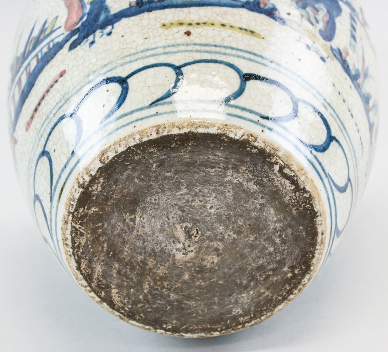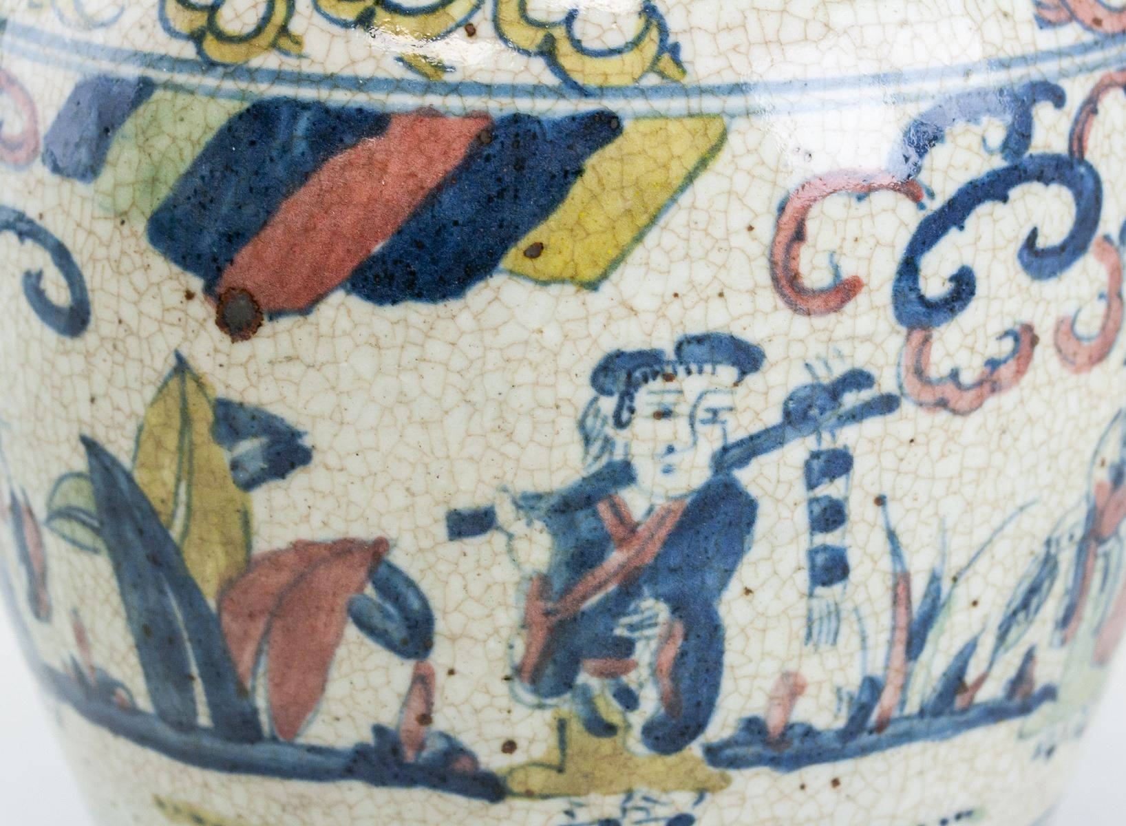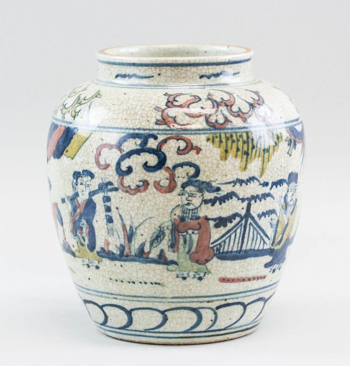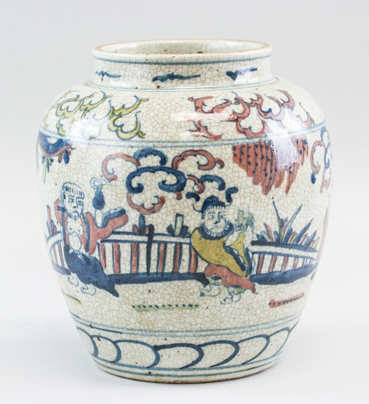 Chinese porcelain jar. Of famille rose with crackle. Painted with various figures. Of Ming style. With round opening and ovid body. Resting on flat bottom. 21 x 18 cm, 1959 grams.
