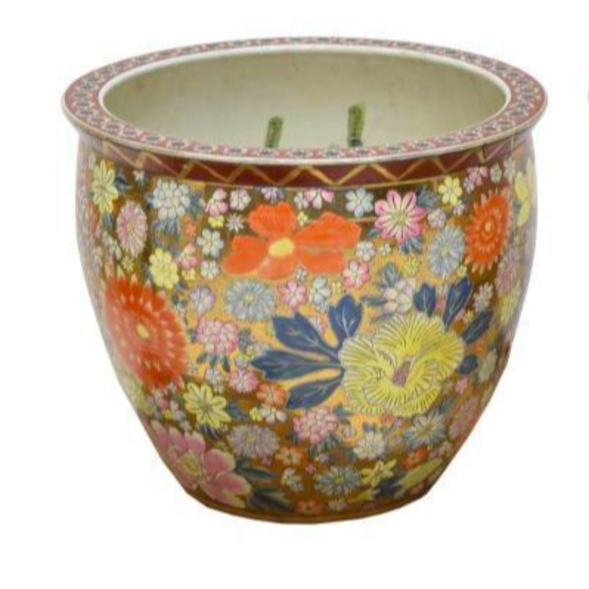 Chinese famille rose parcel-gilt enameled porcelain fishbowl, with polychrome flower design to exterior, goldfish & sea plants to interior, approx 15 3/4" H X 18 1/2" D. Â