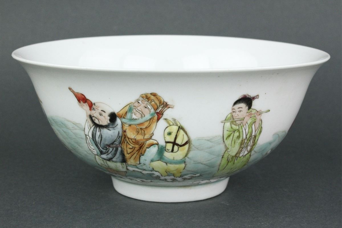 Chinese Famille Rose porcelain bowl; of steep rounded sides rising to everted rim; painted with eight immortals crossing the sea; six-character Qianlong mark on base; H: 7 cm, D: 16 cm, 245 grams