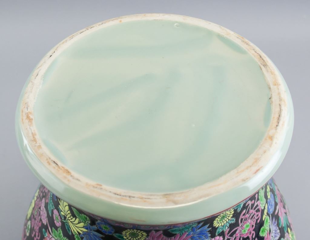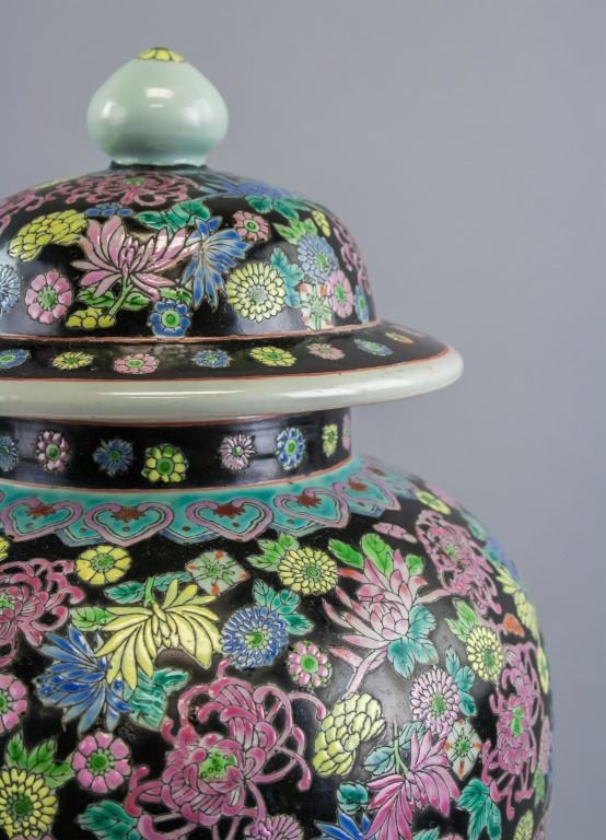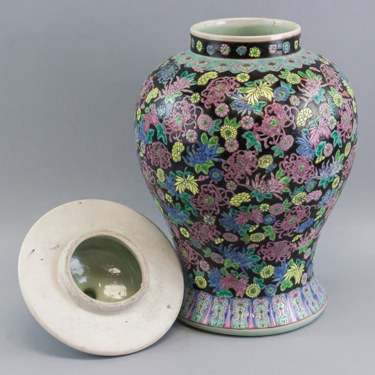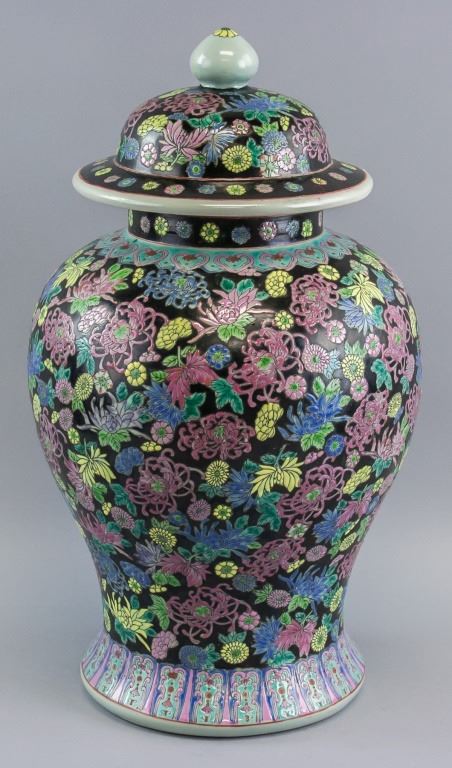 Chinese ceramic jar. Of famille rose. With round opening and short neck, with broad shoulders narrowing at the base. With domed lid. 41 x 22 cm . 5.5 kg.