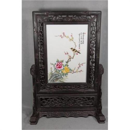 Chinese Famille Rose Porcelain Table Screen. Decorate with bird and floral. Good condition. 15" x 10.5" porcelain itself.