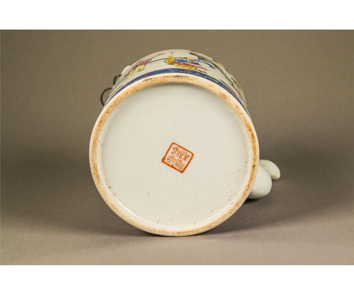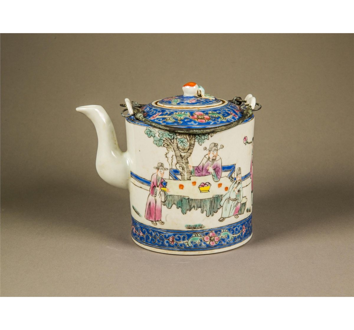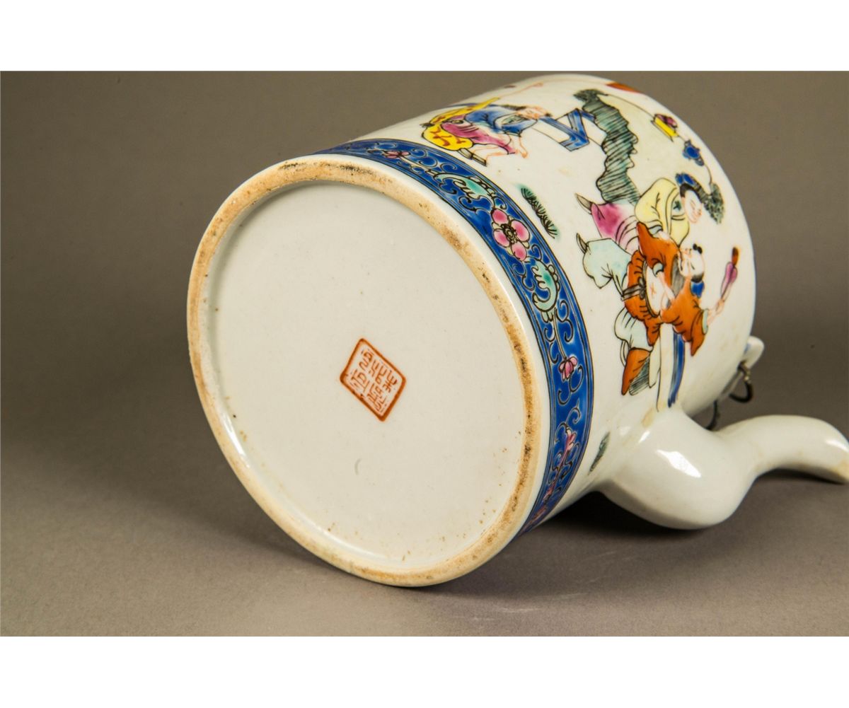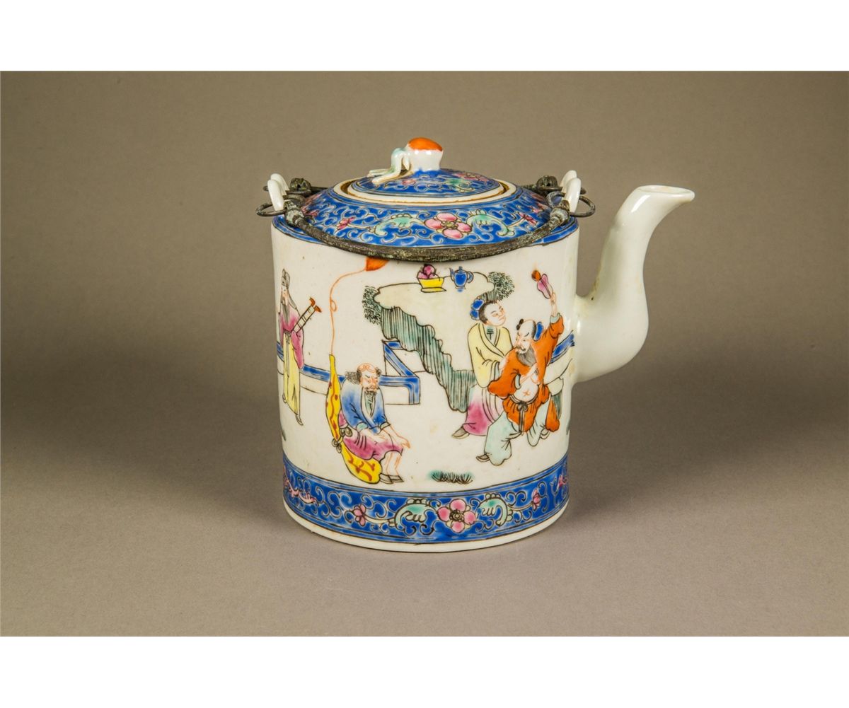 Chinese Famille Rose enameled porcelain teapot; of cylindrical body with sprout and bronze handle; featuring emperor watching plays; four-character red seal mark on base; H: 15 cm, W: 18 cm, 830 grams
