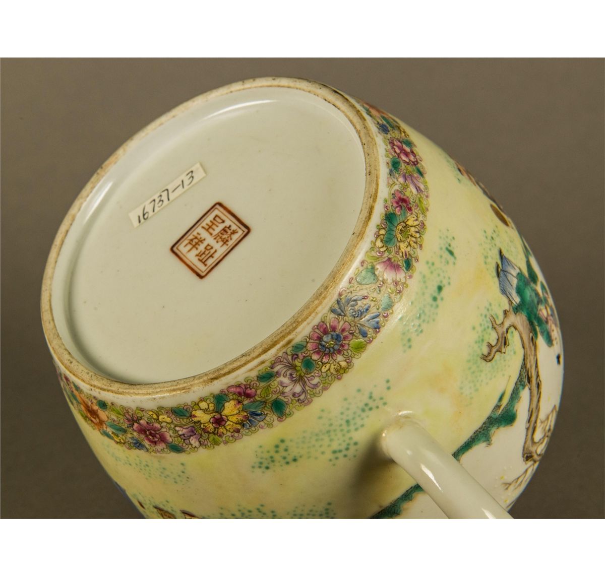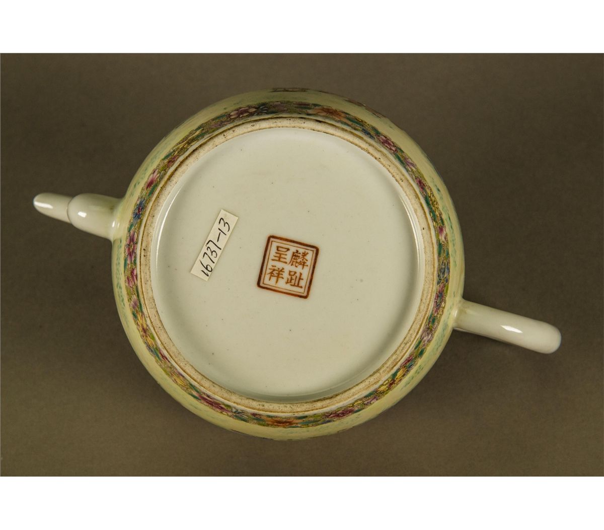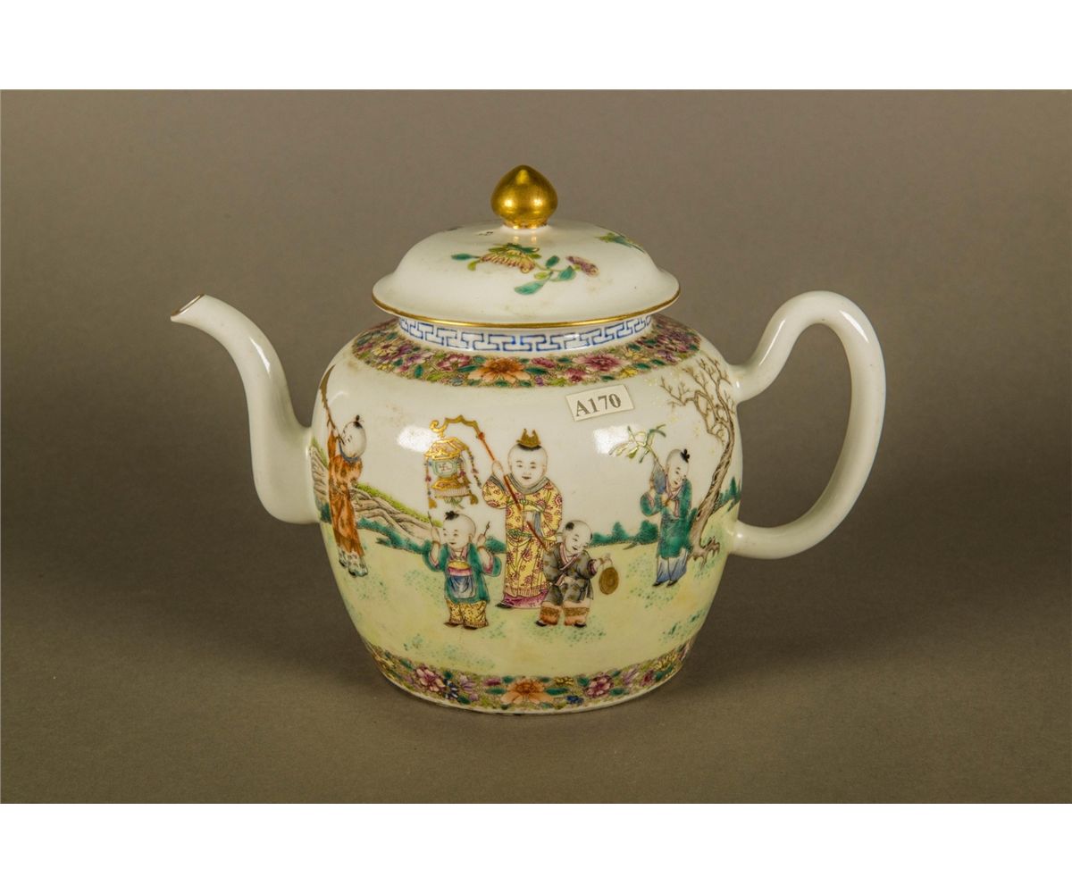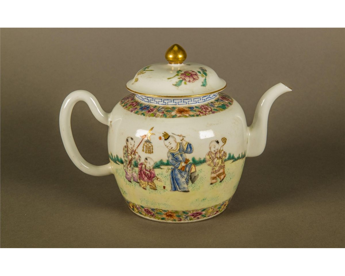 Chinese Famille Rose porcelain teapot with cover; with handle and sprout; featuring emperor playing with children; four-character Lin Zhi Cheng Xiang mark(meaning The qilin's footprints reveal great luck) on base; H: 15 cm, W: 23 cm, 648 grams