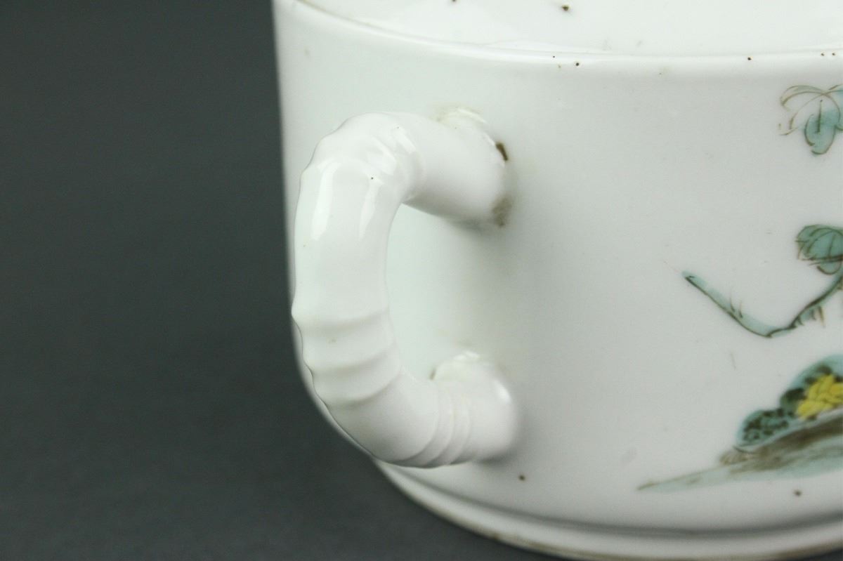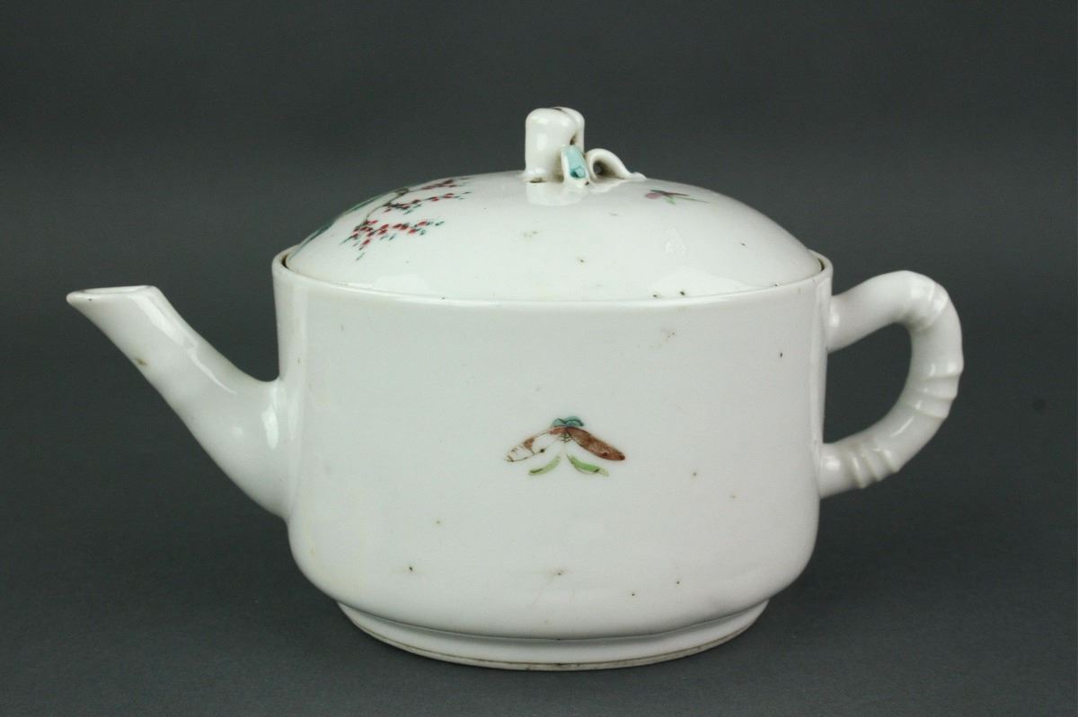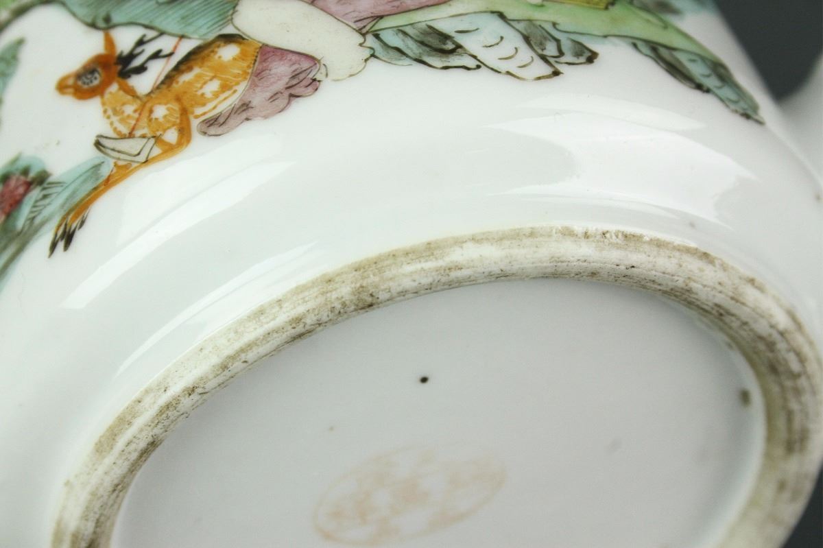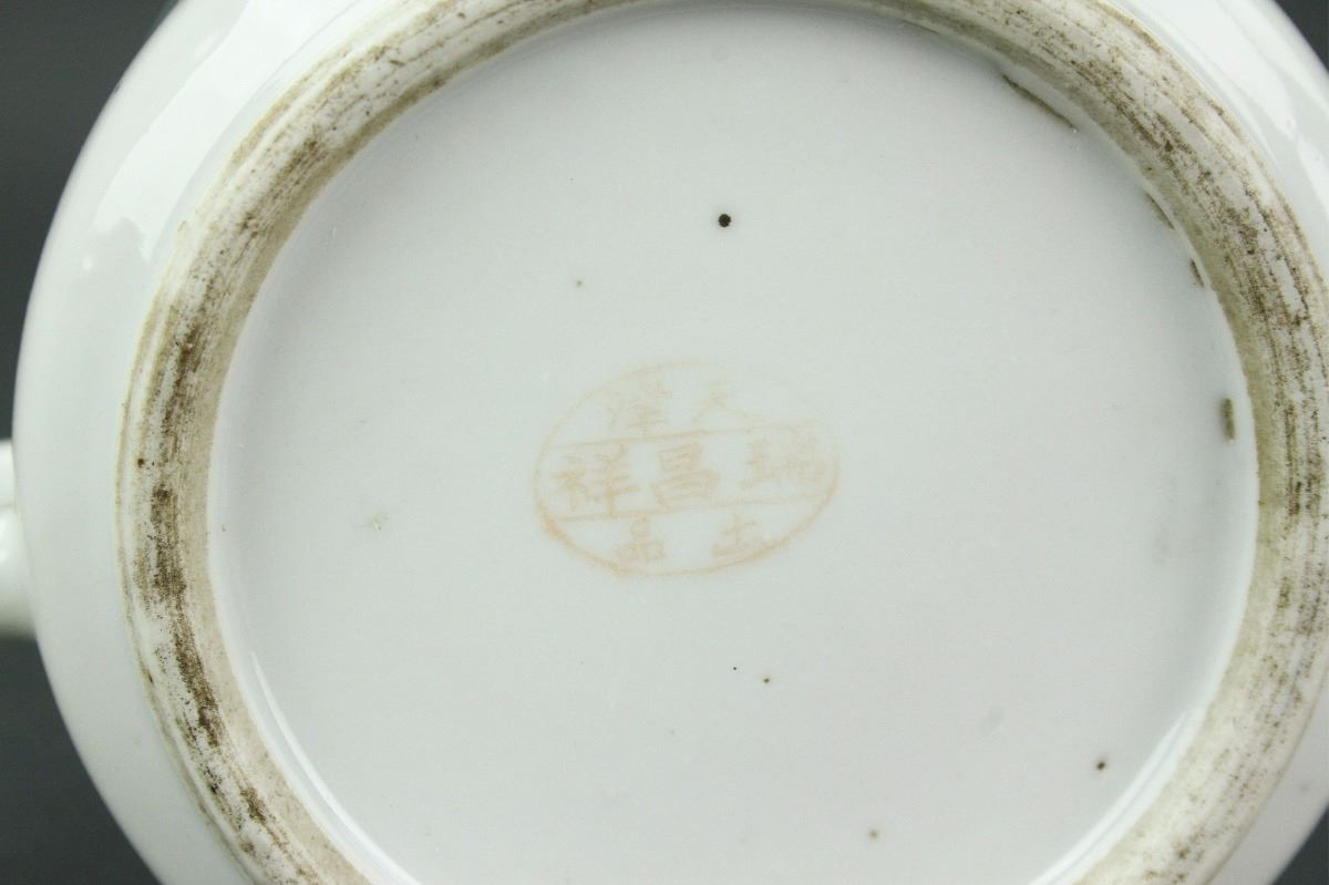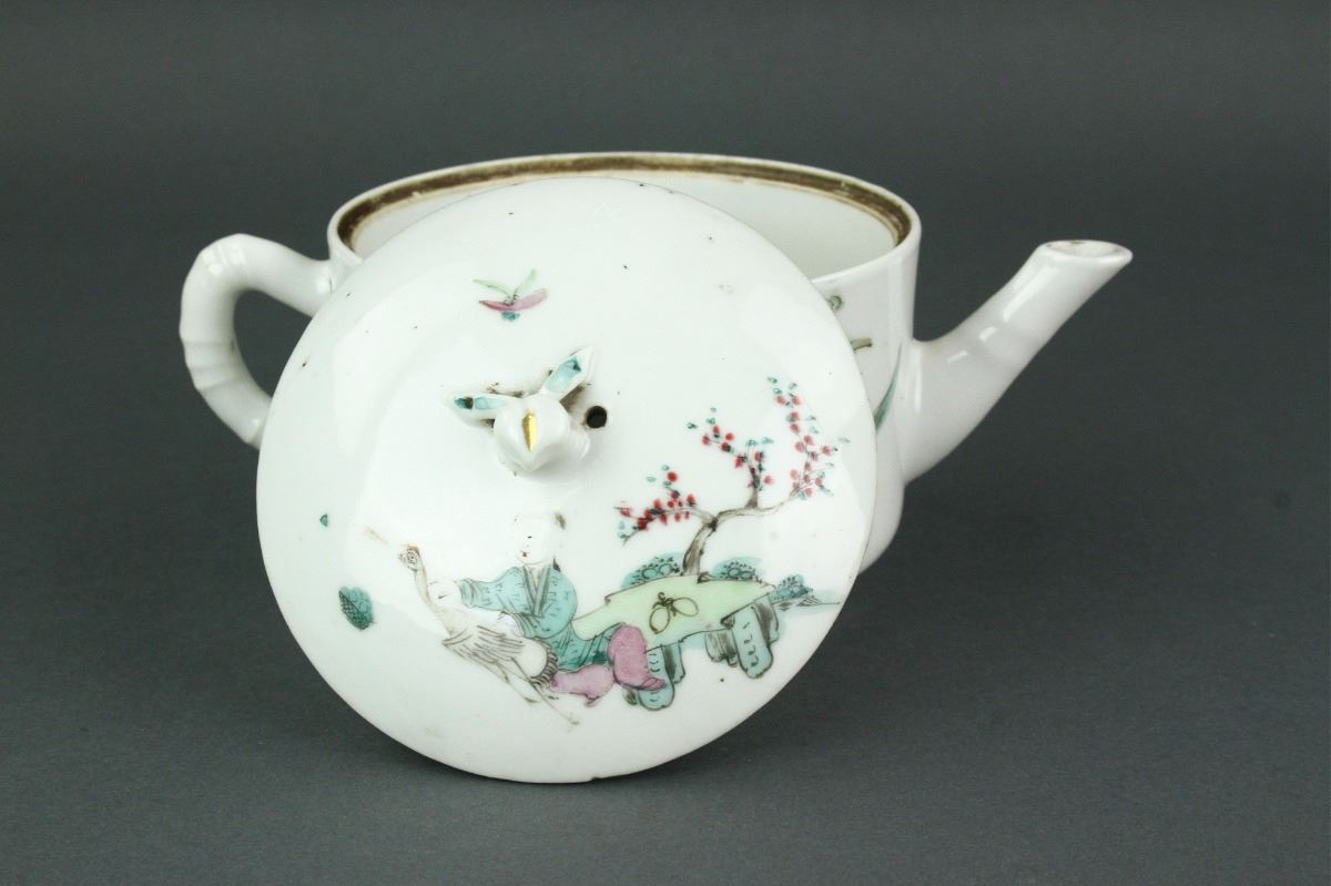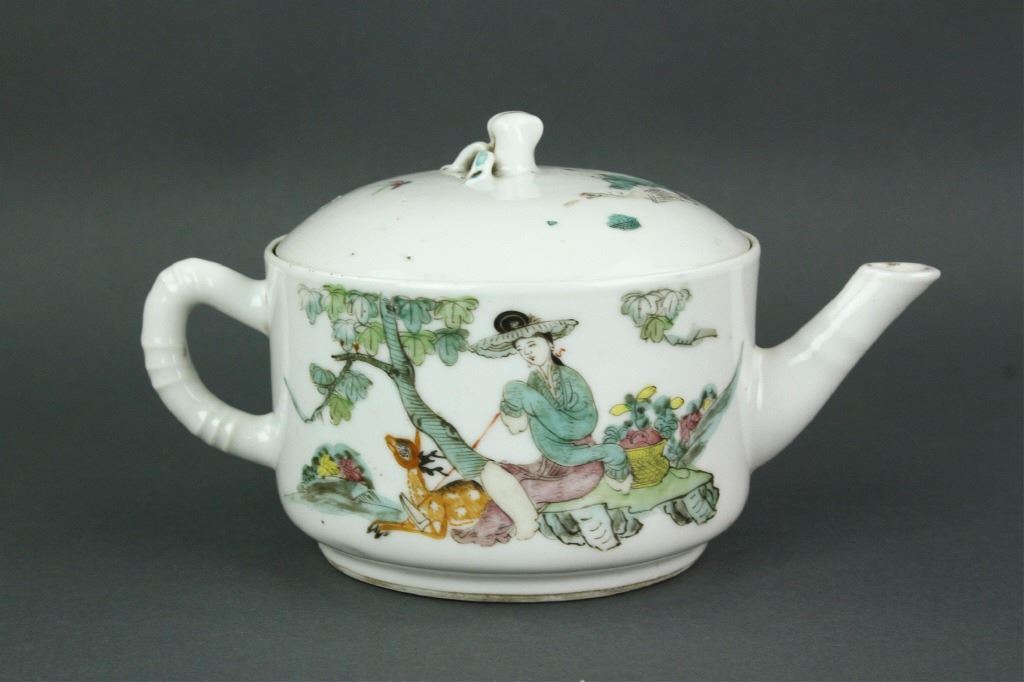 Chinese Famille Rose porcelain teapot with cover; of cylindrical body with curved handle and spout; featuring painting of figures on body and cover; Rui Chang Xiang red mark on base; H: 7 cm, D: 11 cm, 385 grams