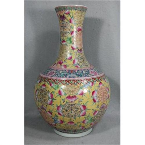 Chinese Famille Rose Porcelain Vase. Decorate with peaches and bets. Good condition. 18" high.