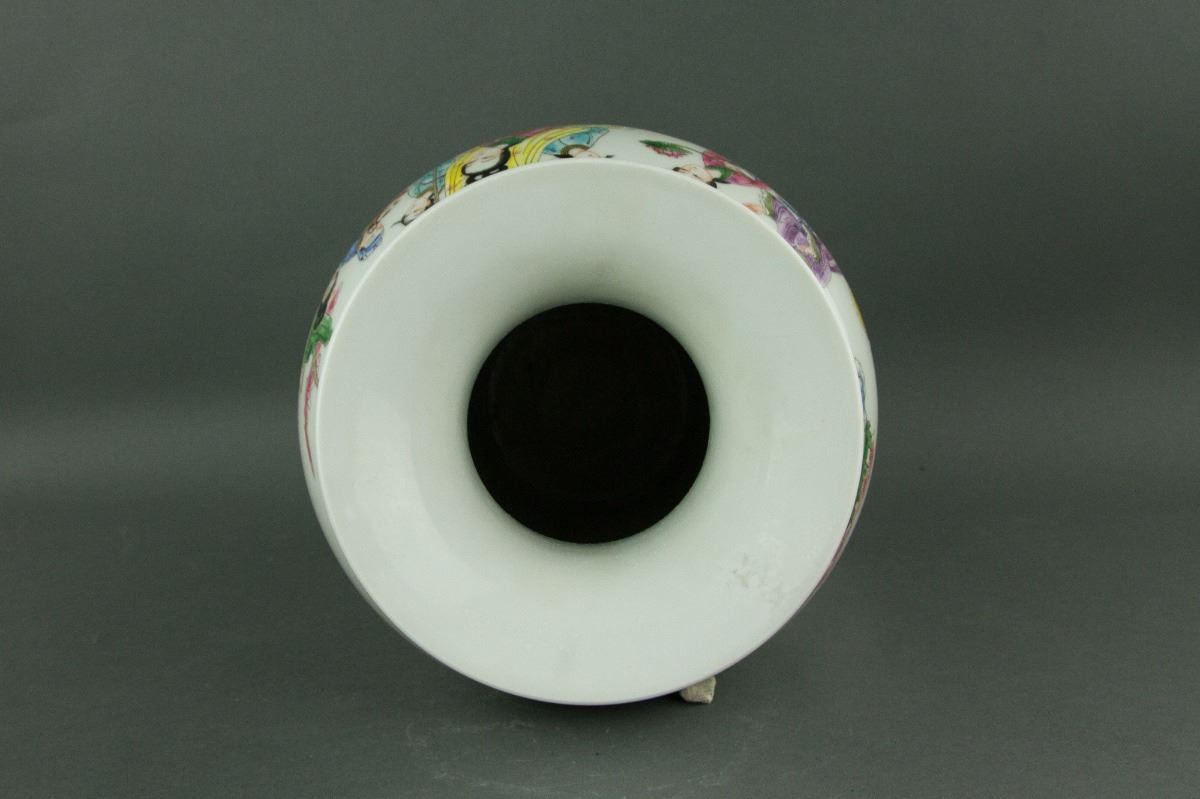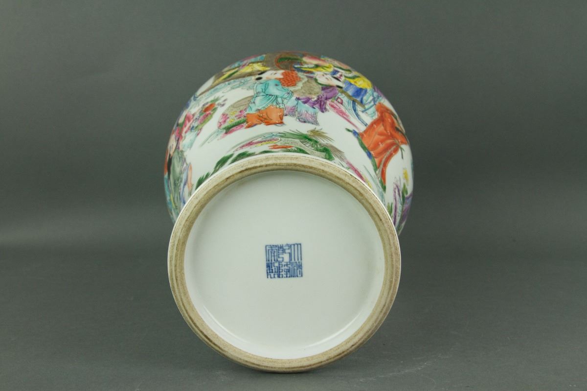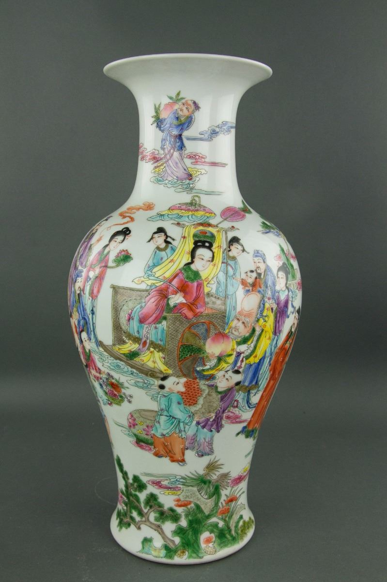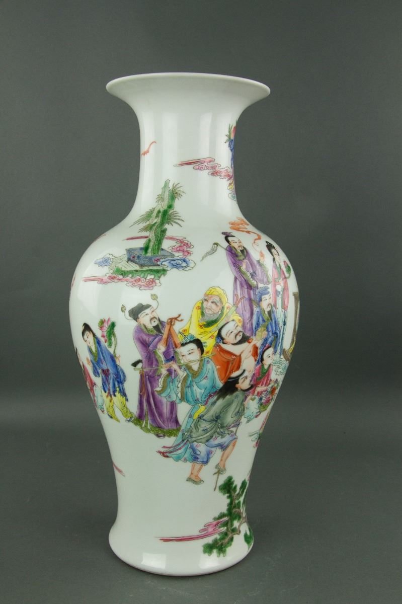 Chinese famille rose porcelain vase; of baluster form with splayed foot; body painted eight immortals and Shouxin; six-character Qianlong mark on base; H: 44.5 cm, W:22 cm, 3267 grams
