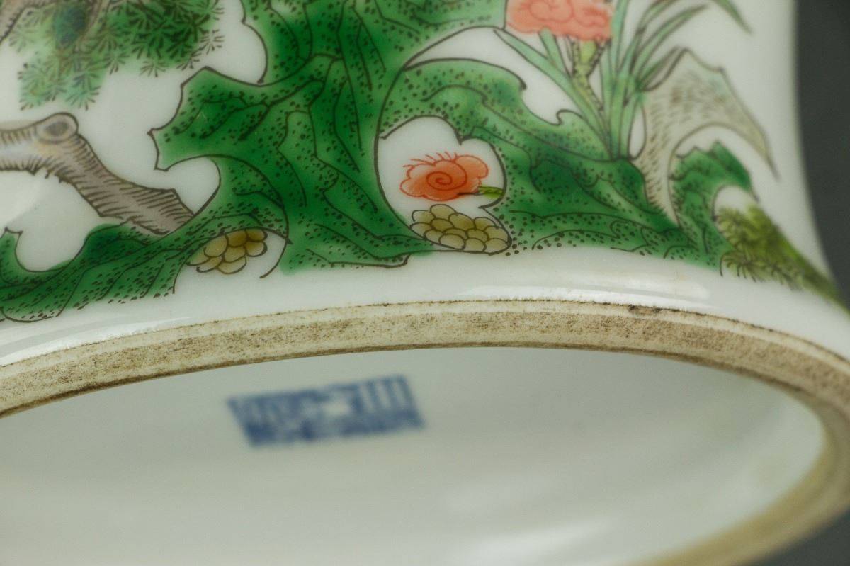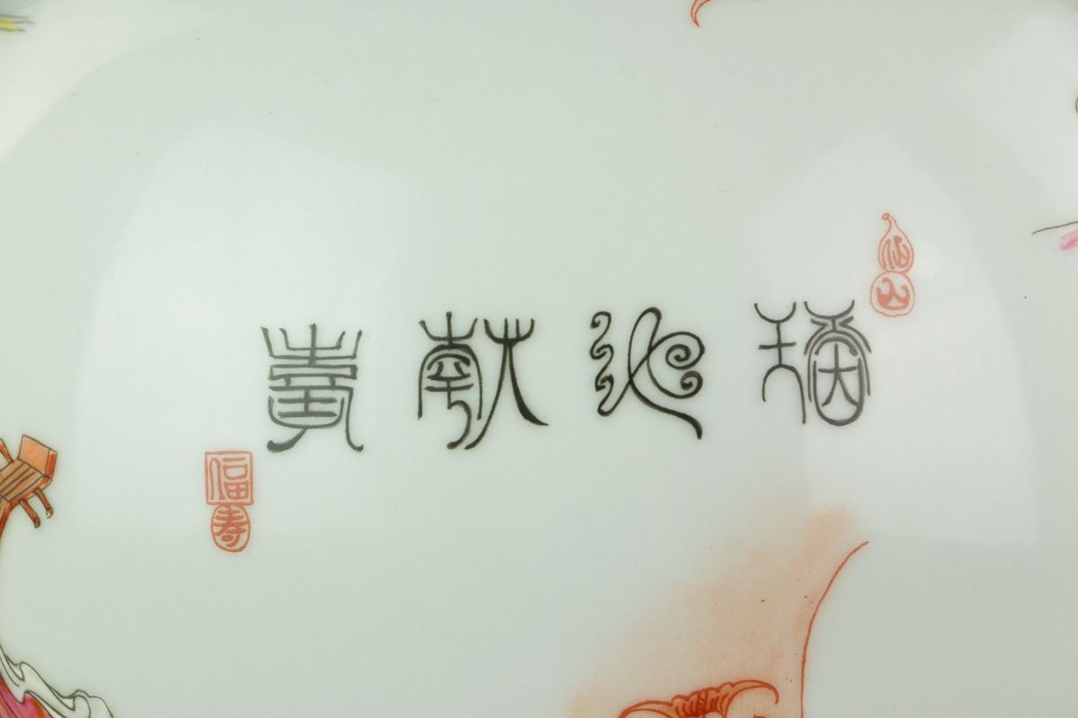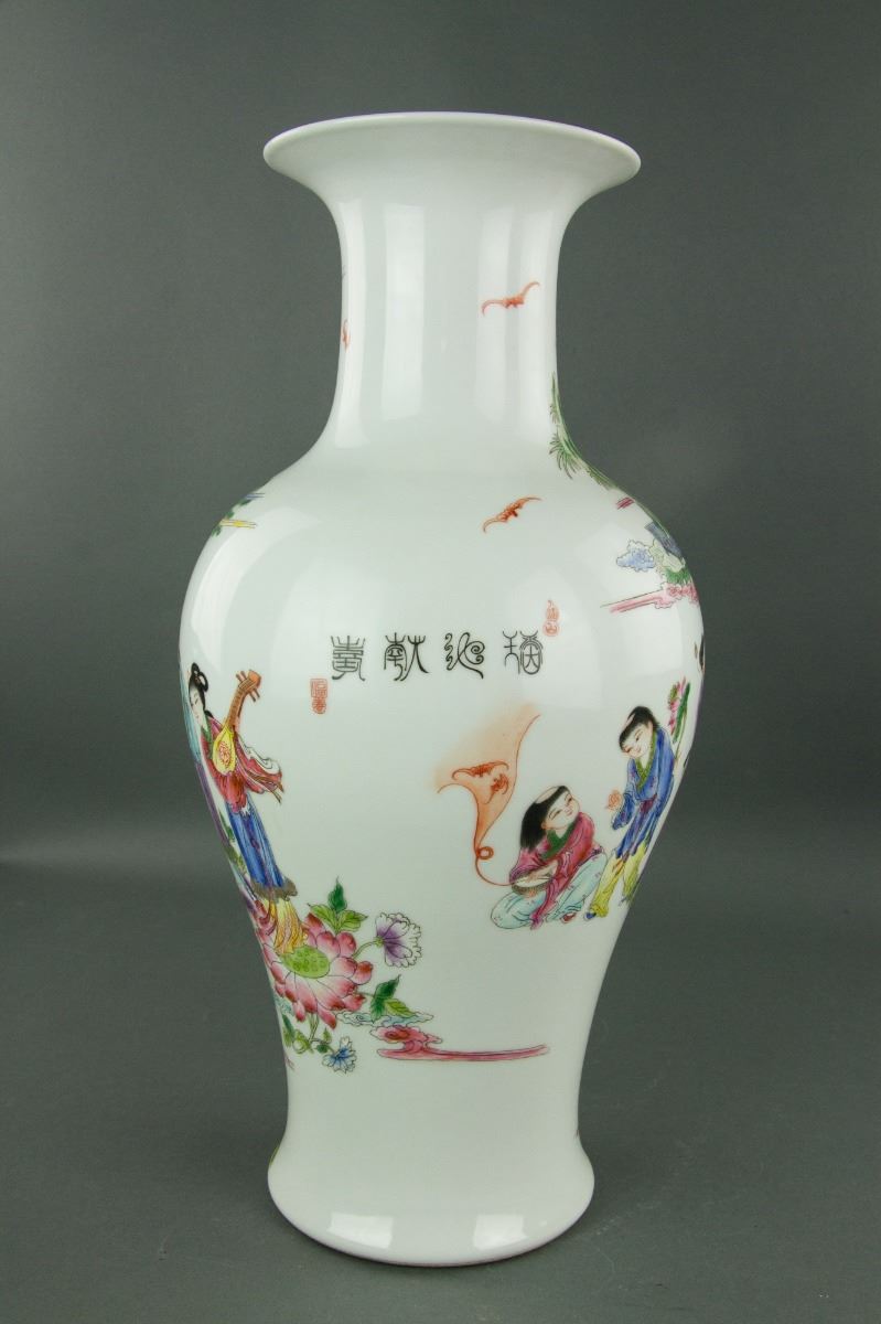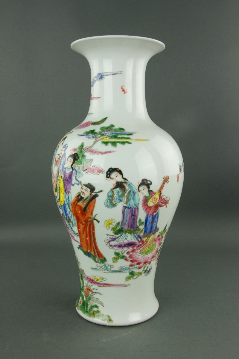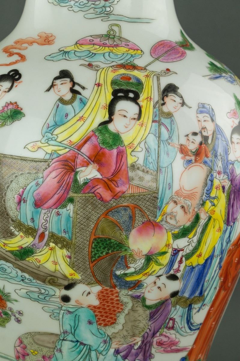 Chinese famille rose porcelain vase; of baluster form with splayed foot; body painted eight immortals and Shouxin; six-character Qianlong mark on base; H: 44.5 cm, W:22 cm, 3267 grams