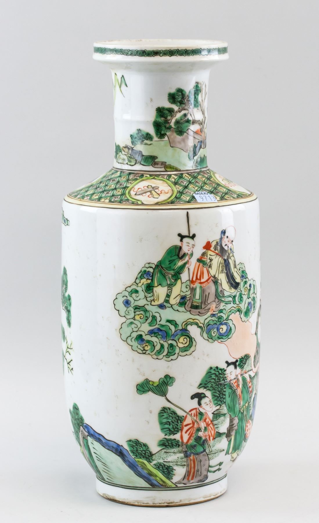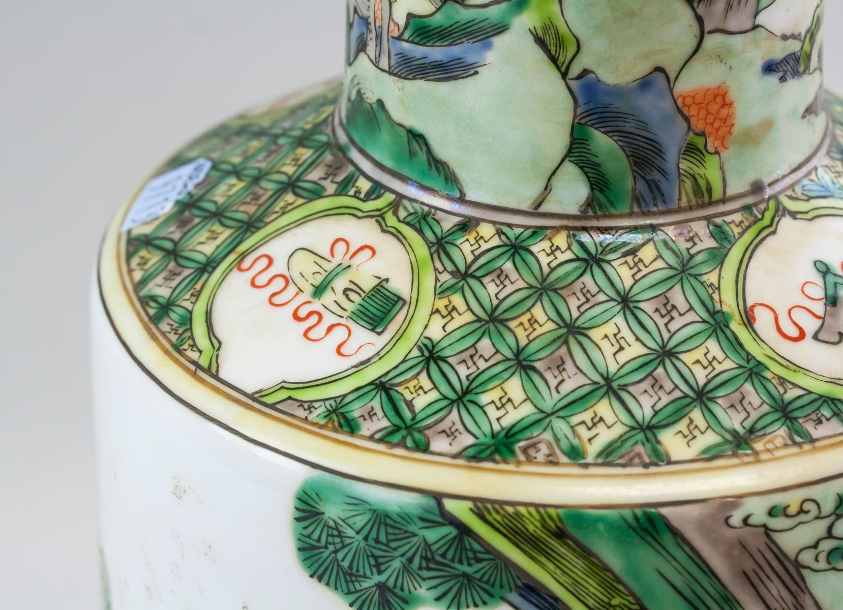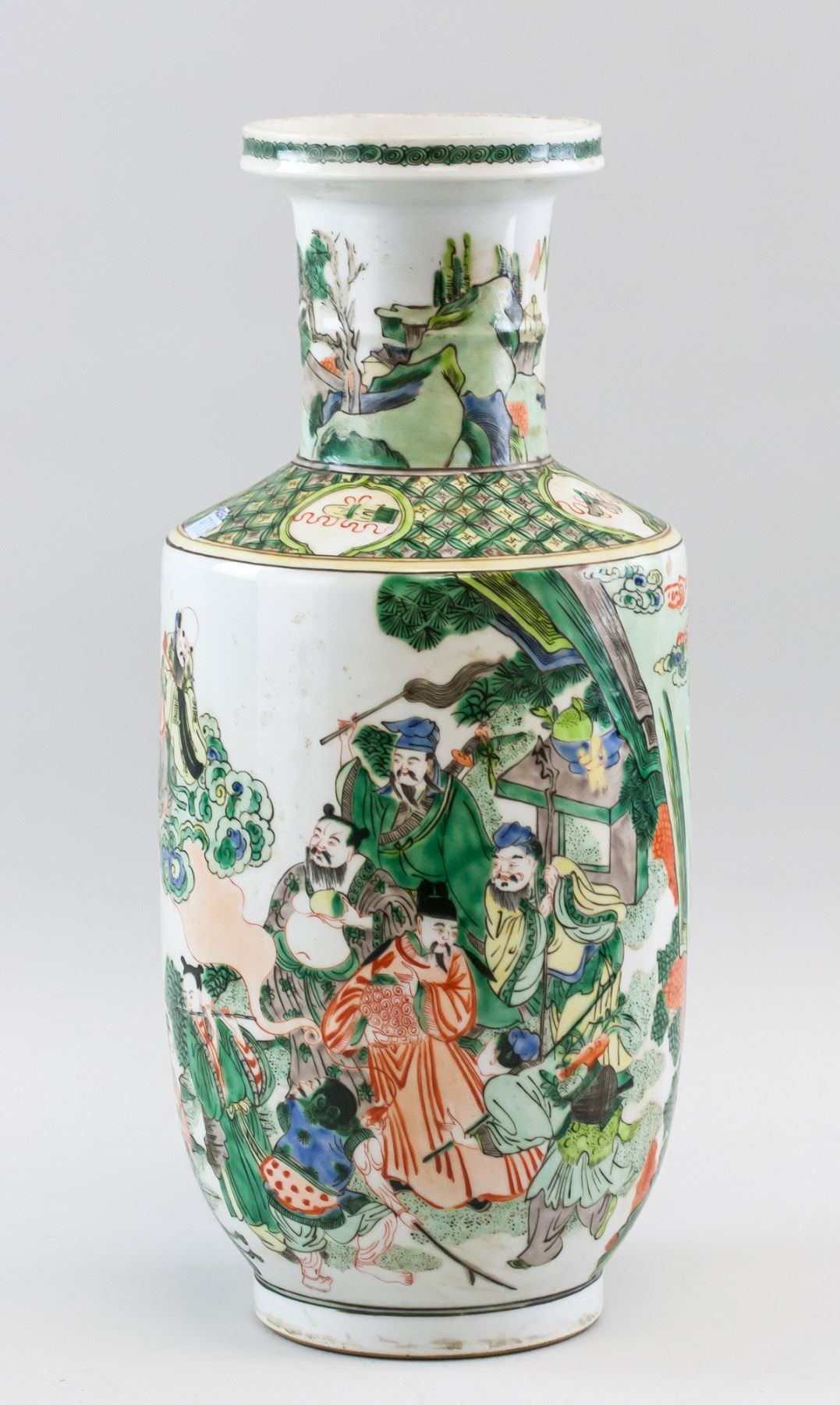 Chinese famille verte vase. Painted with scholars and immortals. WIth wide opening, straight neck, and long oval body. Resting on short foot rim. Six character Qing dynasty Kangxi mark on base. 41 x 18 cm, 3225 grams.