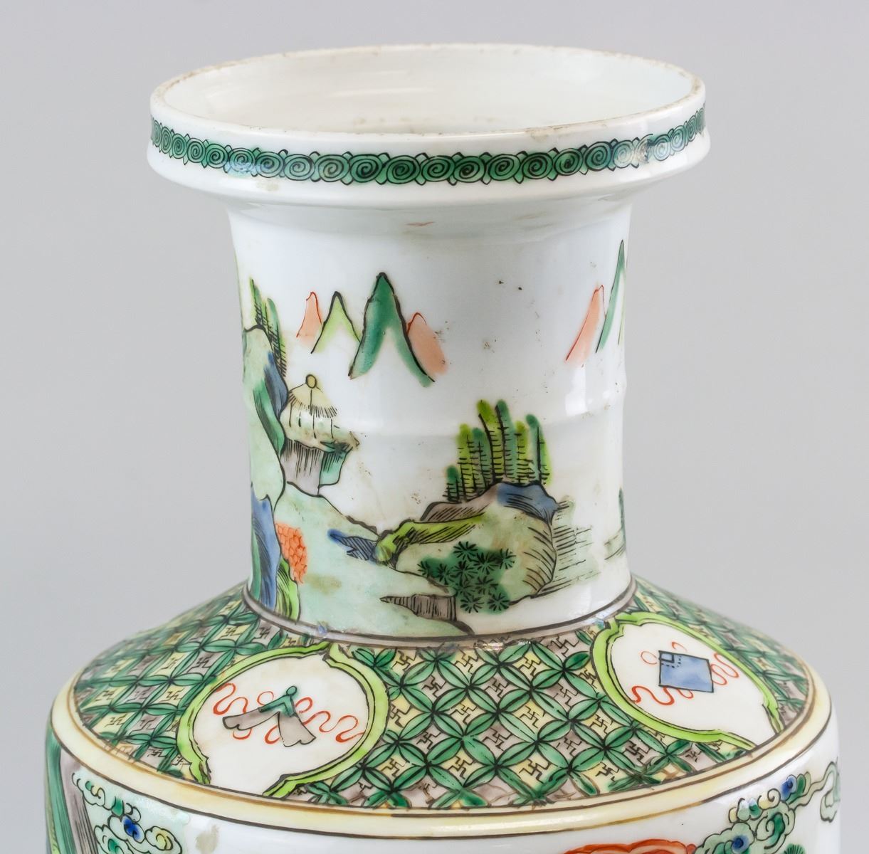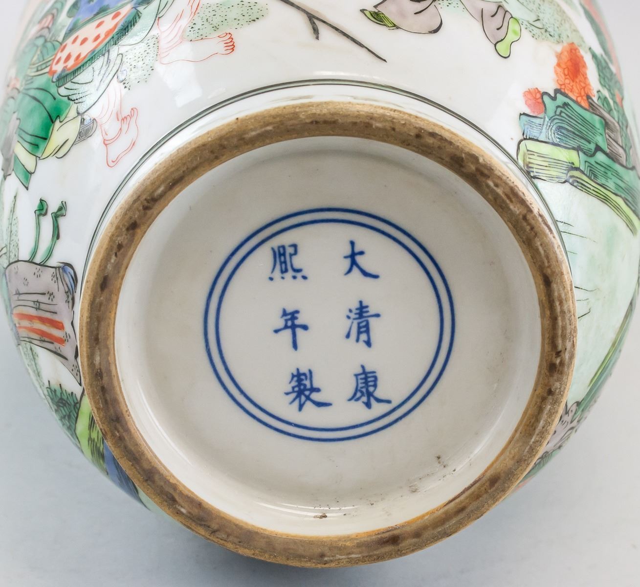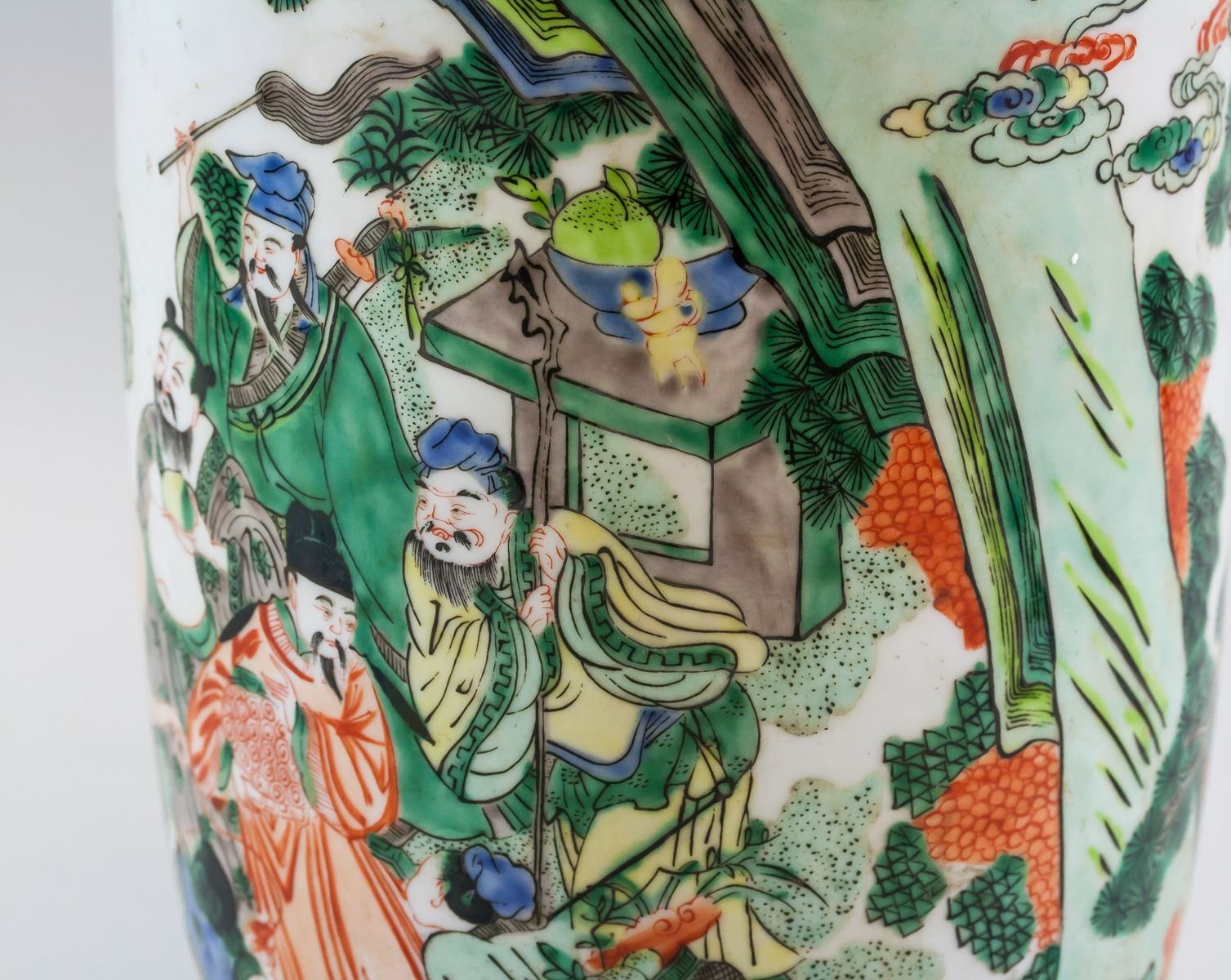 Chinese famille verte vase. Painted with scholars and immortals. WIth wide opening, straight neck, and long oval body. Resting on short foot rim. Six character Qing dynasty Kangxi mark on base. 41 x 18 cm, 3225 grams.