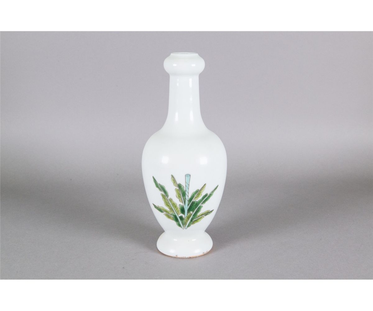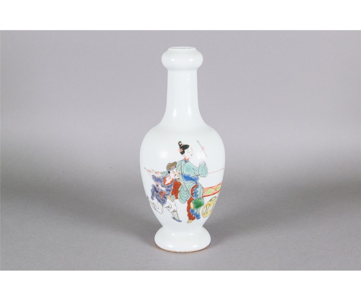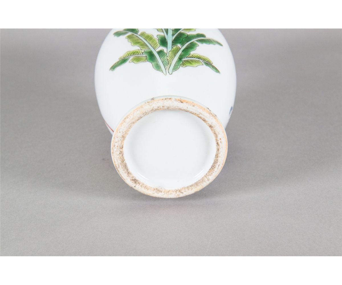 Chinese Famille Verte enameled porcelain vase; of baluster form with garlic-shaped opening; featuring a man and a woman with banana leaves; H: 25 cm, D: 10 cm, 635 grams