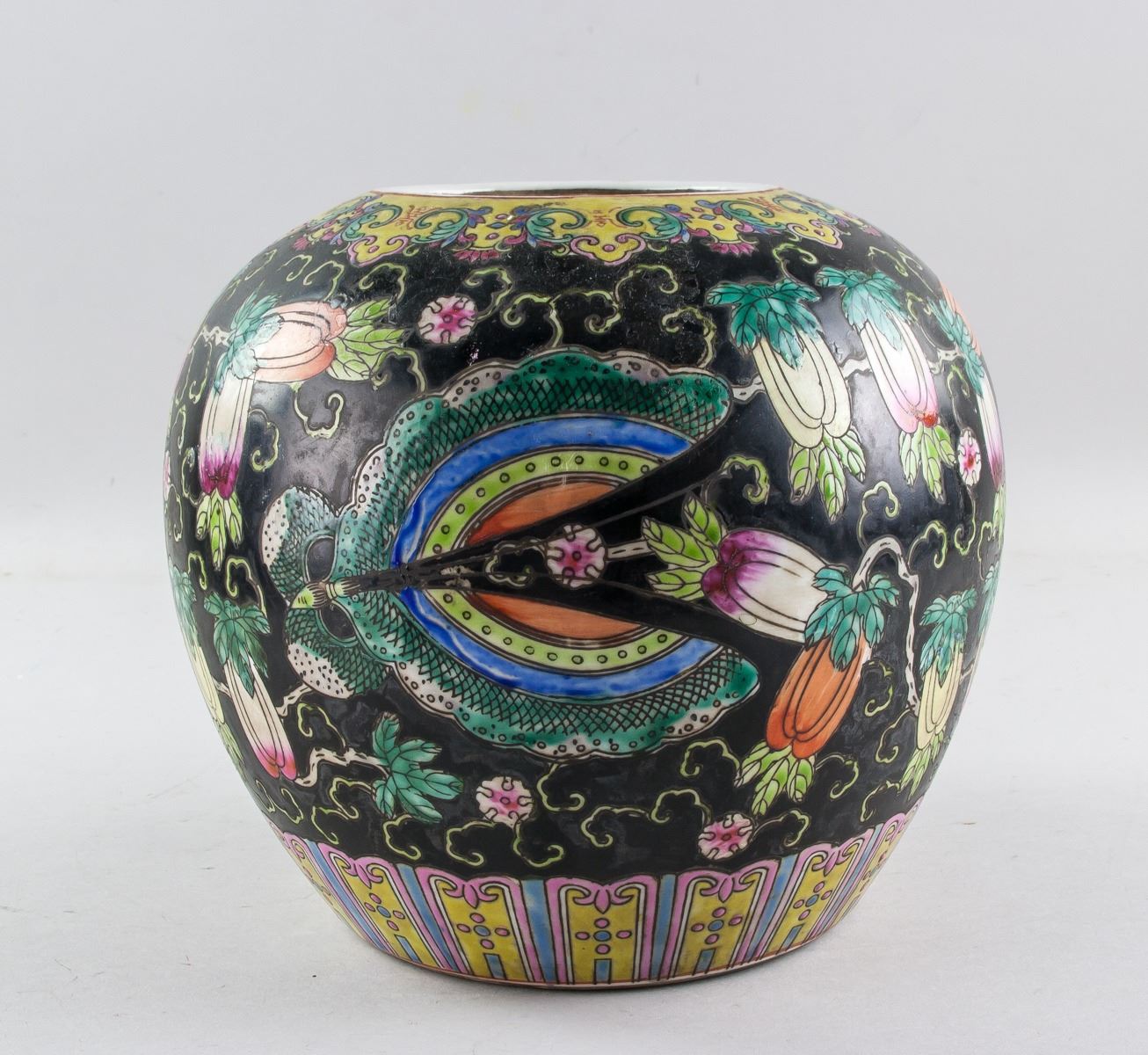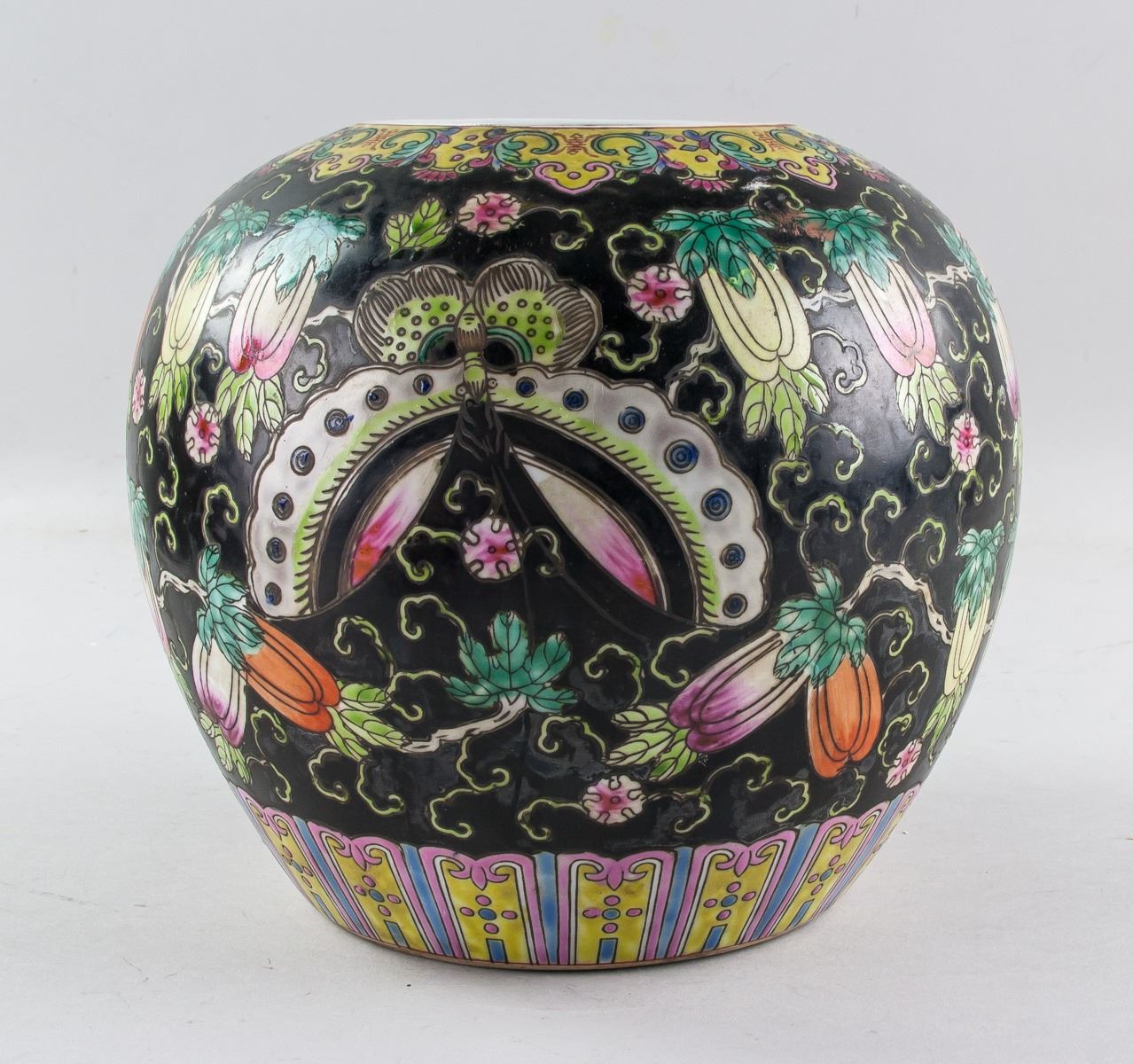 Chinese famille verte porcelain jar, of globular body, painted with butterflies and vegetables, decorated with floral pattern, 22 x 24 cm, 2277 grams