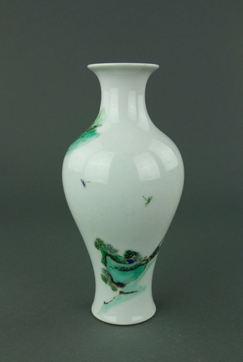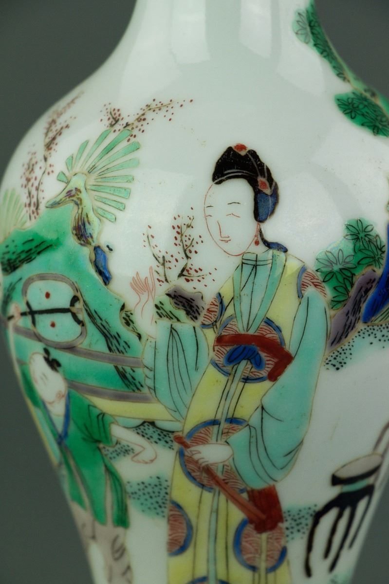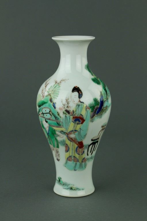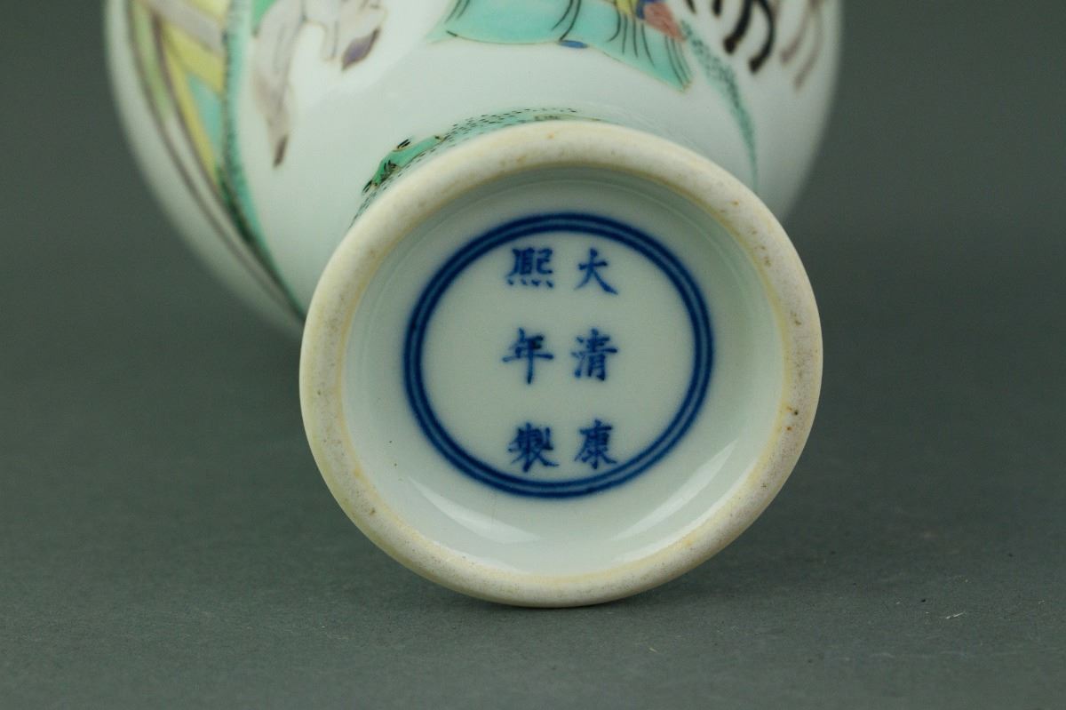 Chinese Famille Verte porcelain vase; of baluster form; painted with a lady figure and a boy at courtyard; six-character Kangxi mark on base; H: 20 cm, D: 10 cm, 369 grams