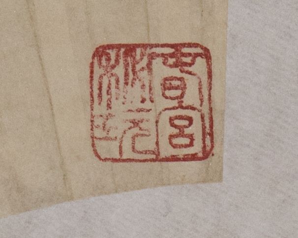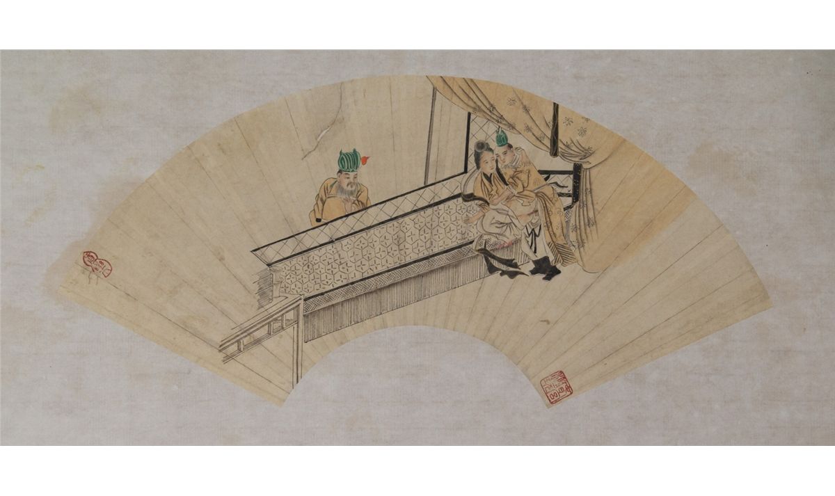 Chinese Fan Painting of Amorous Couple; mounted on paper; inscribed with two artist seals; 52 cm x 19.5 cm