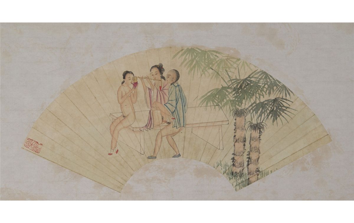 Chinese Fan Painting of Amorous Couple; mounted on paper; inscribed with one artist seal; 52 cm x 19.5 cm