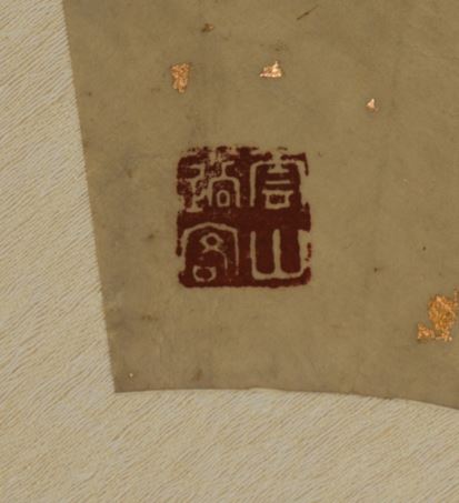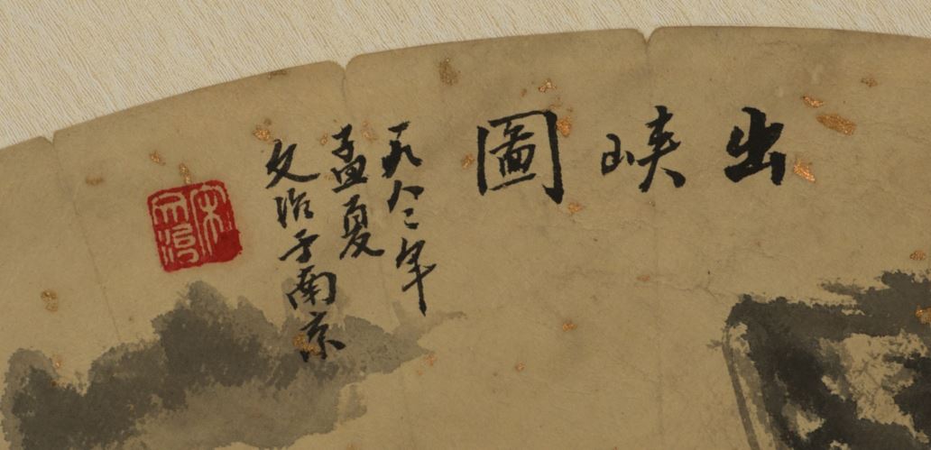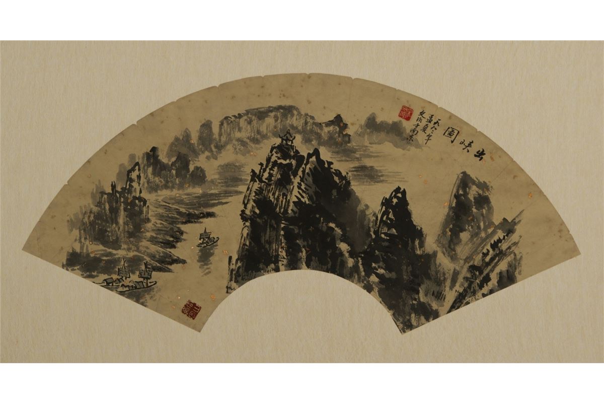 Mountains and river, fan painting, Chinese ink on paper with gold flecks, signed and sealed by artist, marked 1982. 19 cm x 53 cm.