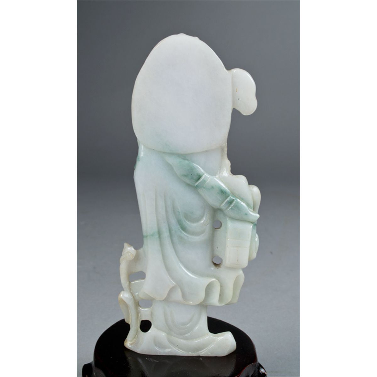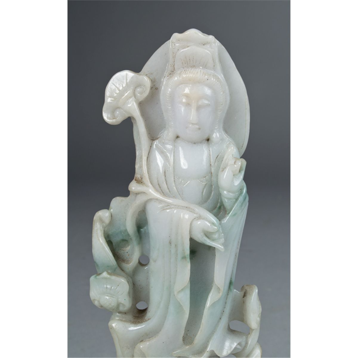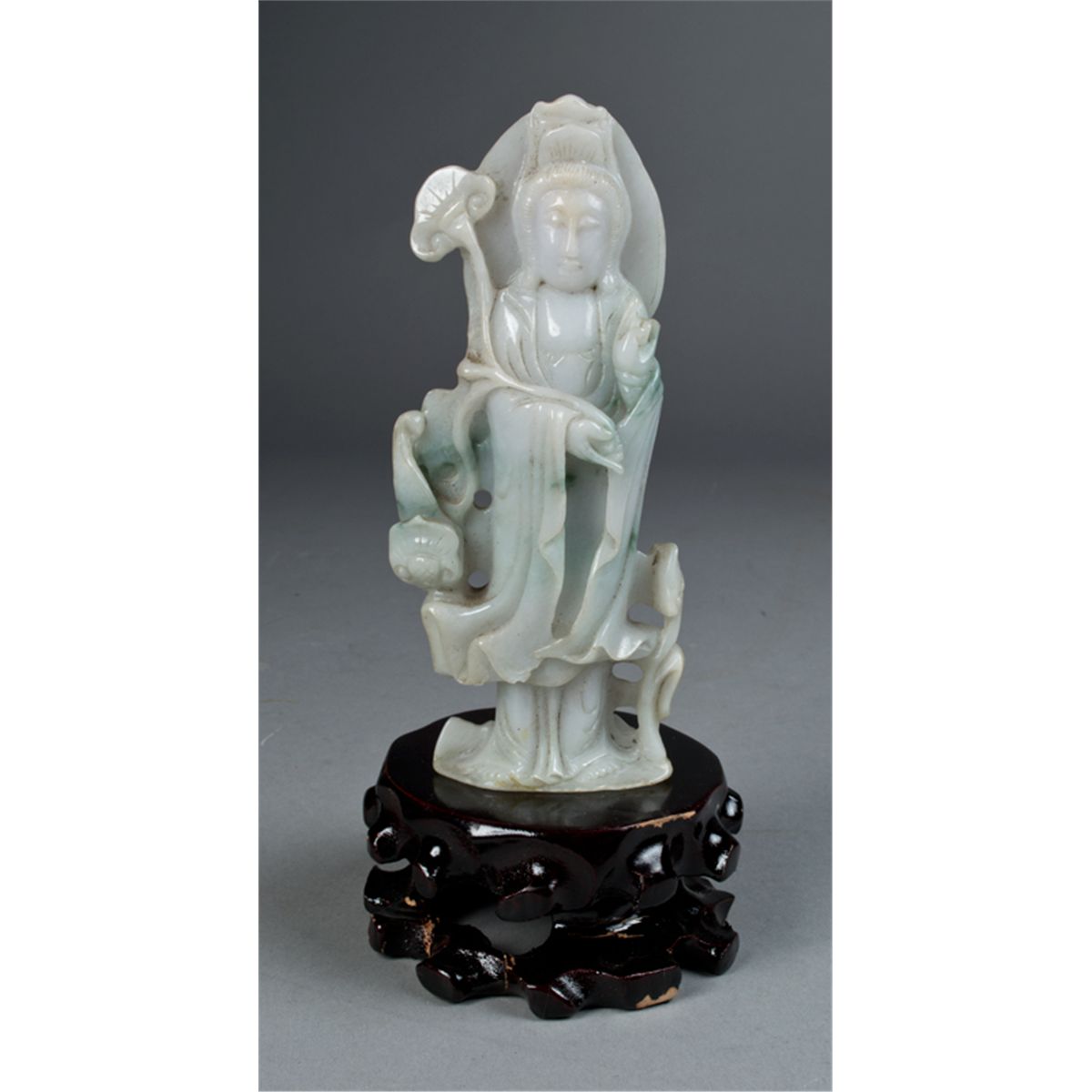 Finely carved to depict Guanyin in white with green inclusions. 5 & 7/8" H, not including stand. Circa 20th century. Private collection Troy, MI.