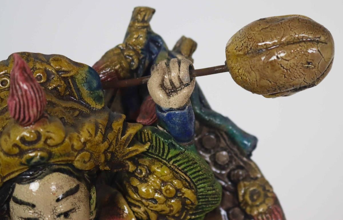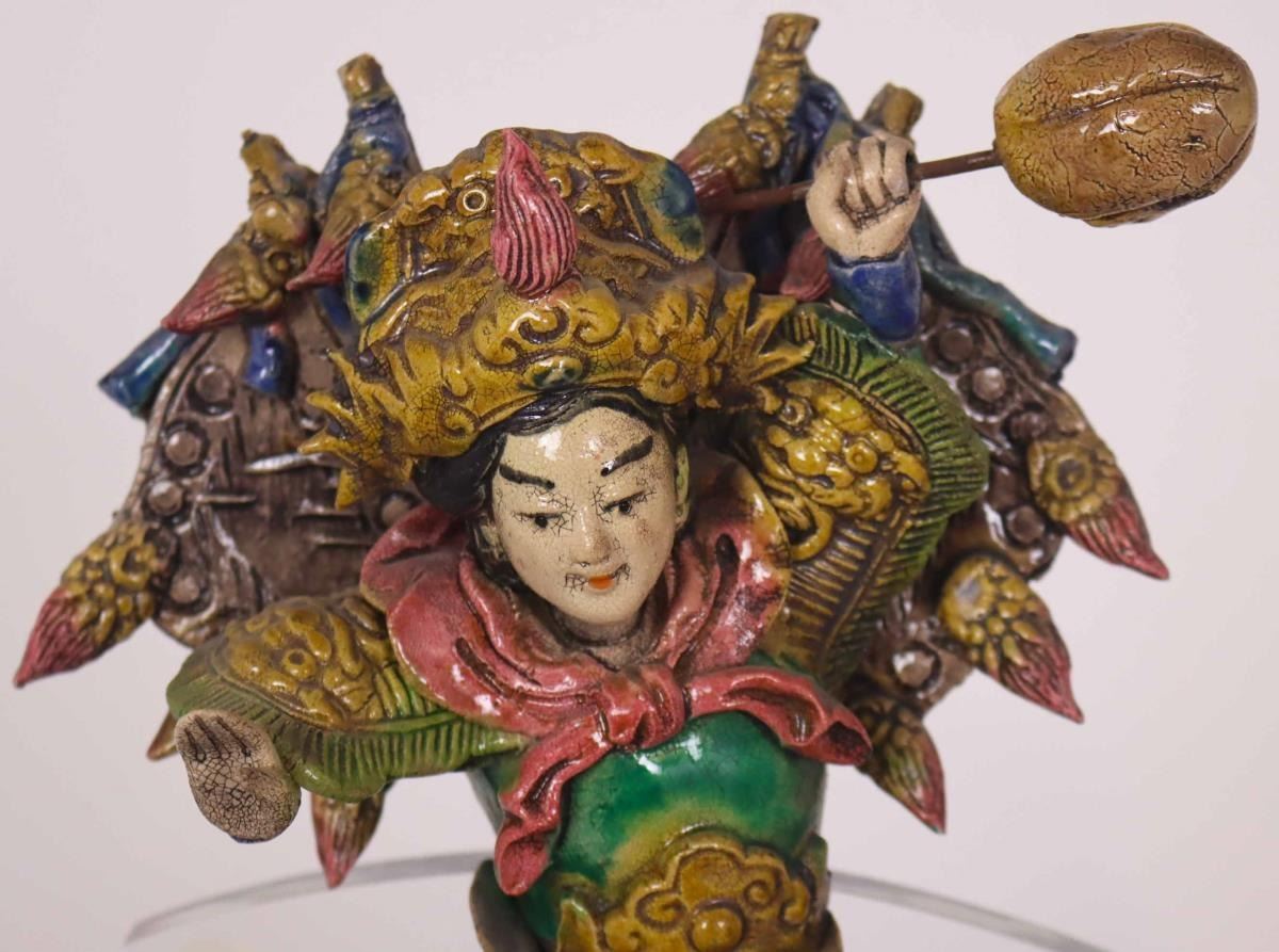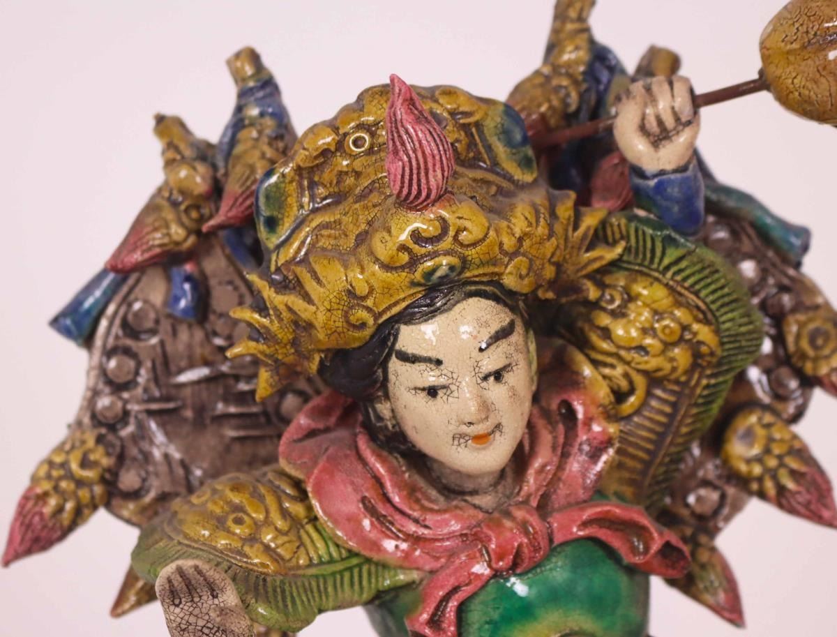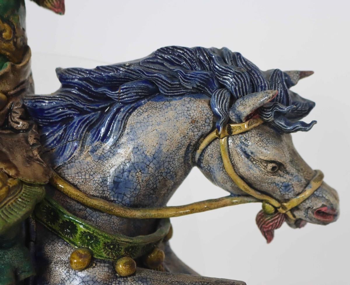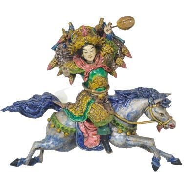 Costumed warrior on a running horse. Ceramic tiles such as this one have been placed on Chinese temple roofs for centuries to ward off evil spirits and attract the attention and good fortune of the gods.