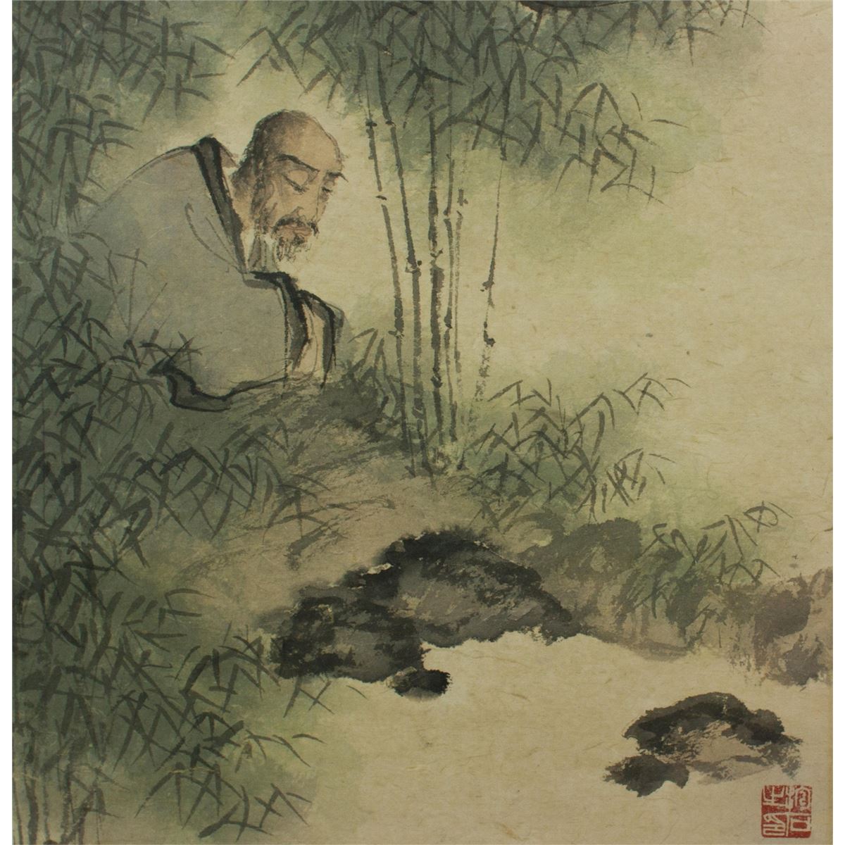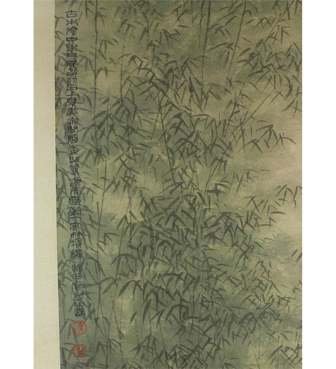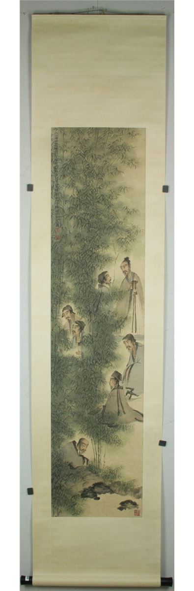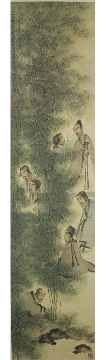 Eight scholars under bamboo, hanging scroll, Chinese ink and watercolour on paper, signed by Fu Baoshi with three seals. 140.5 cm X 33.5 cm.