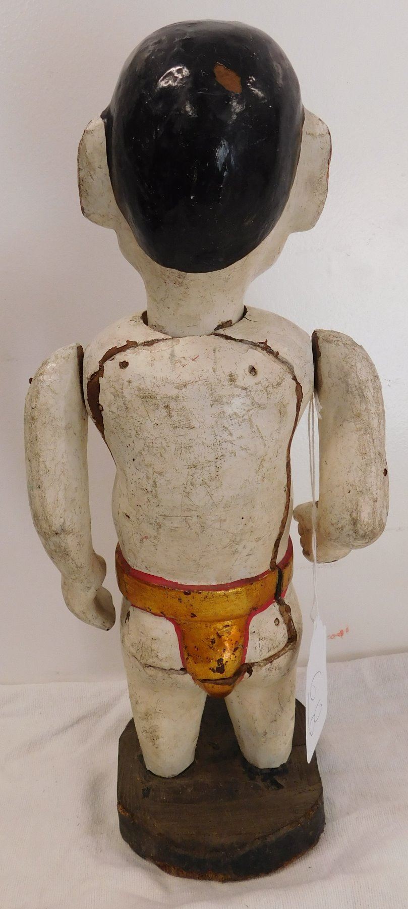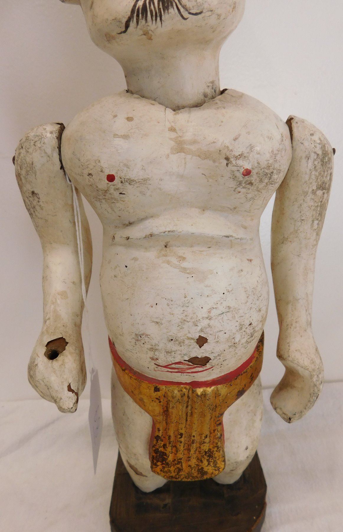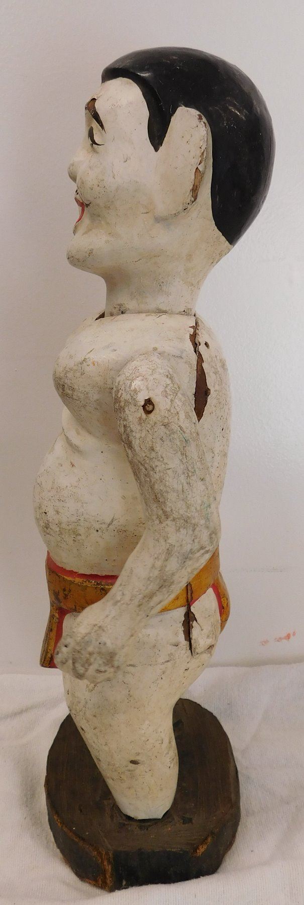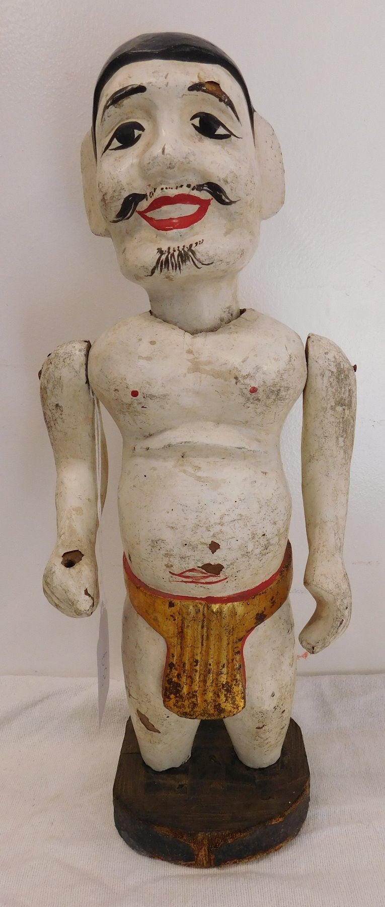 Chinese Figure w/Articulating Arms, circa 1930s. Made of wood and paint, the item measures 7" x 4.75" x 18" tall. China. Arms move at the shoulders. Condition: Some wear and paint loss, see images. Shipping: $35.00 w/insurance and signature, due to size.