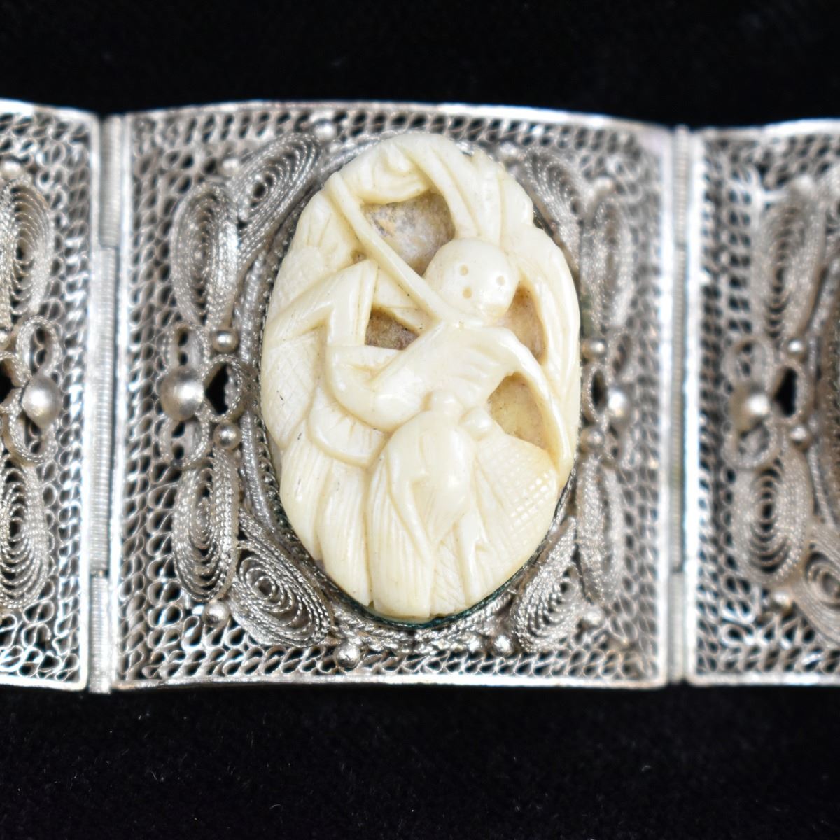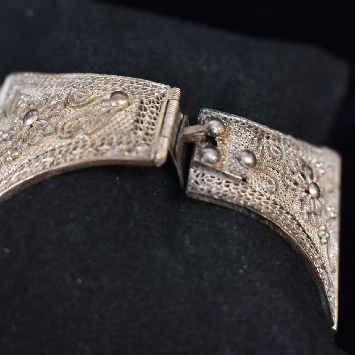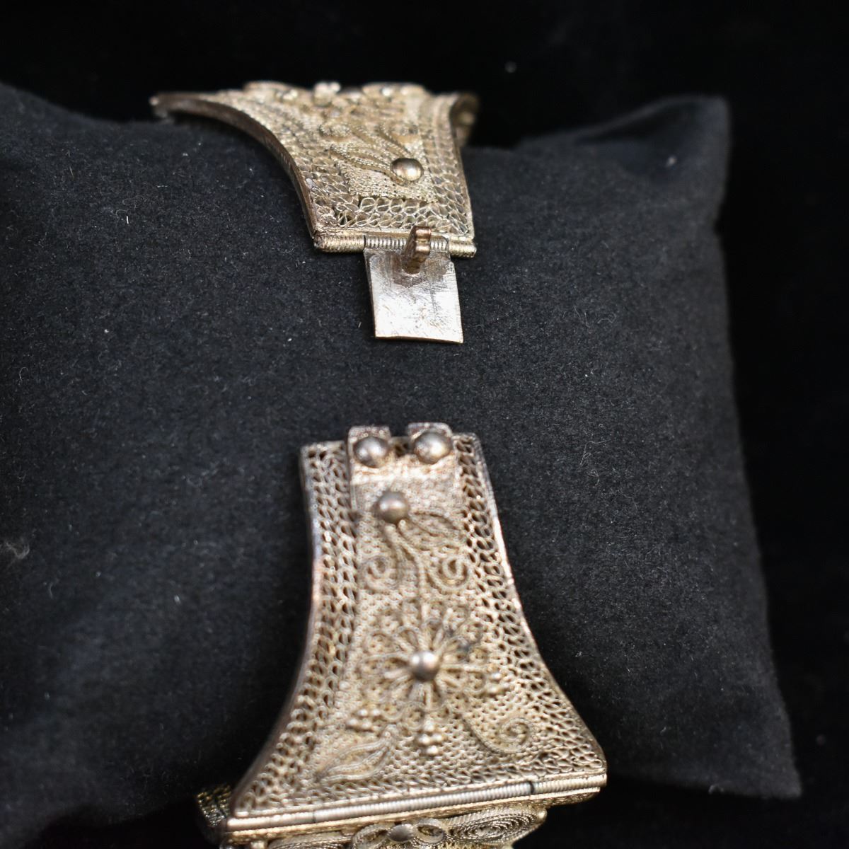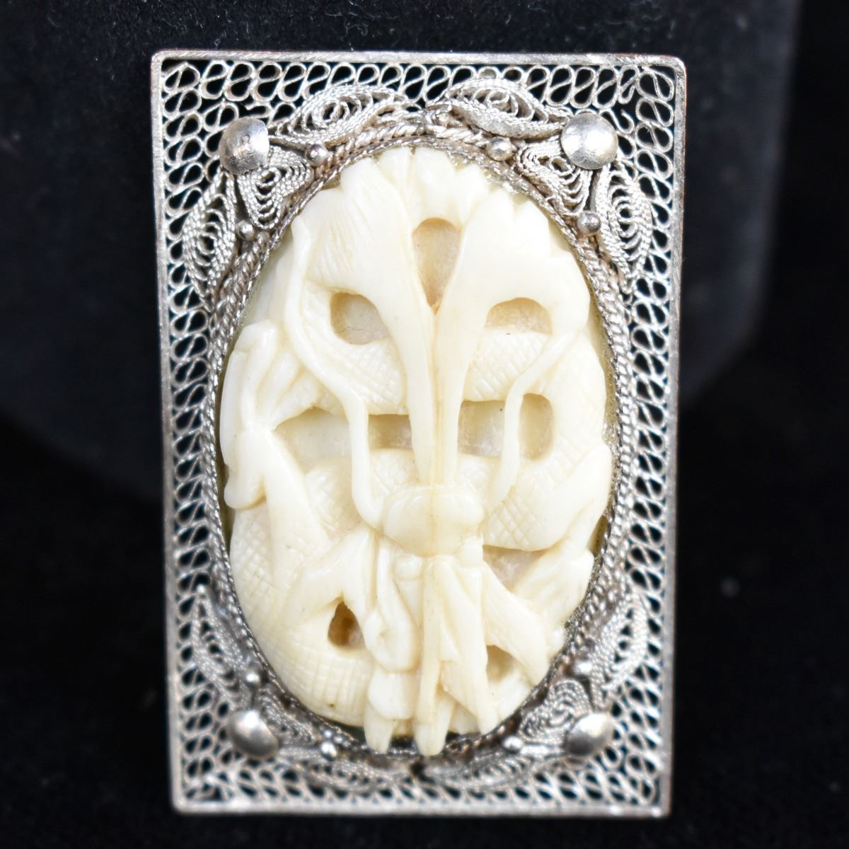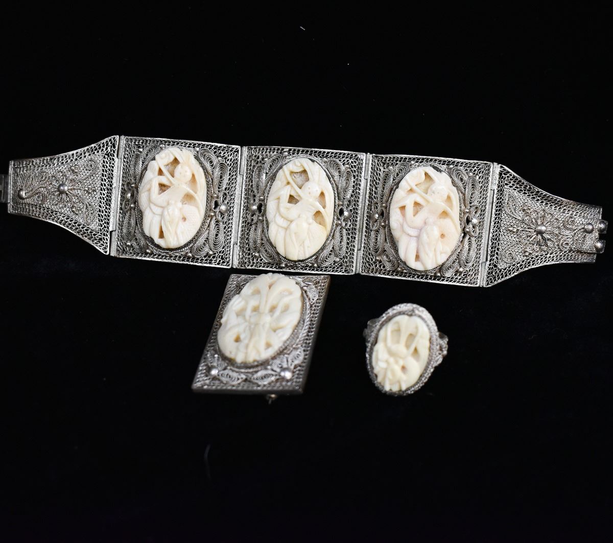 Chinese Filigree Bracelet, Ring, and Pin, bracelet measures 7'' end to end x 1.5''W, ring size 7.75 and measures 7/8''L x .5''W, pin measures 1 5/8''L x 1'', unsure if the ovals are ivory or plastic, pieces are not sterling