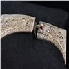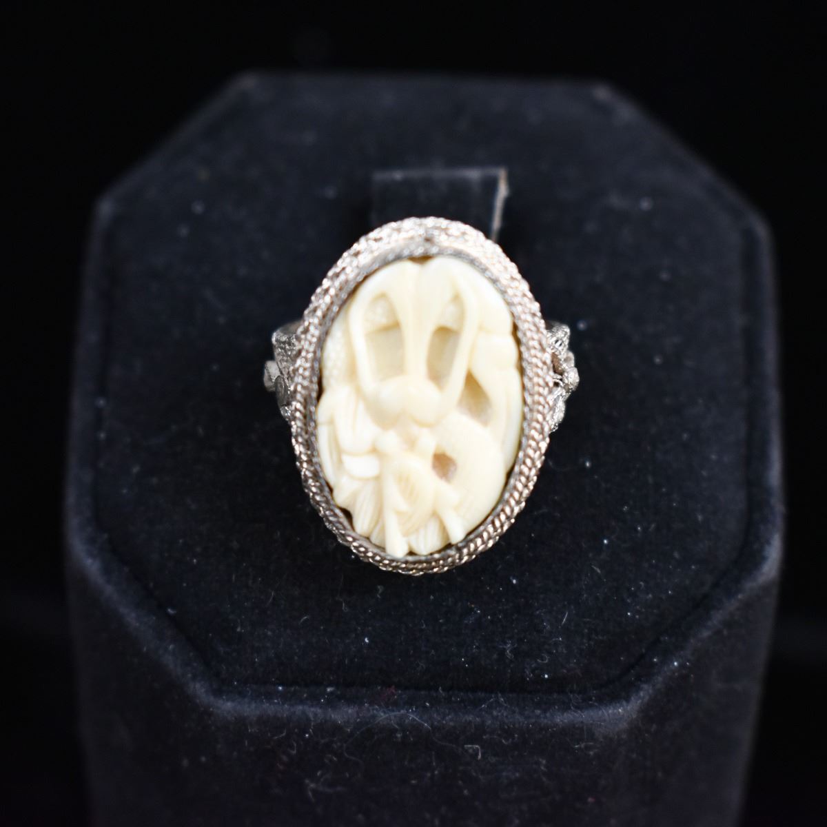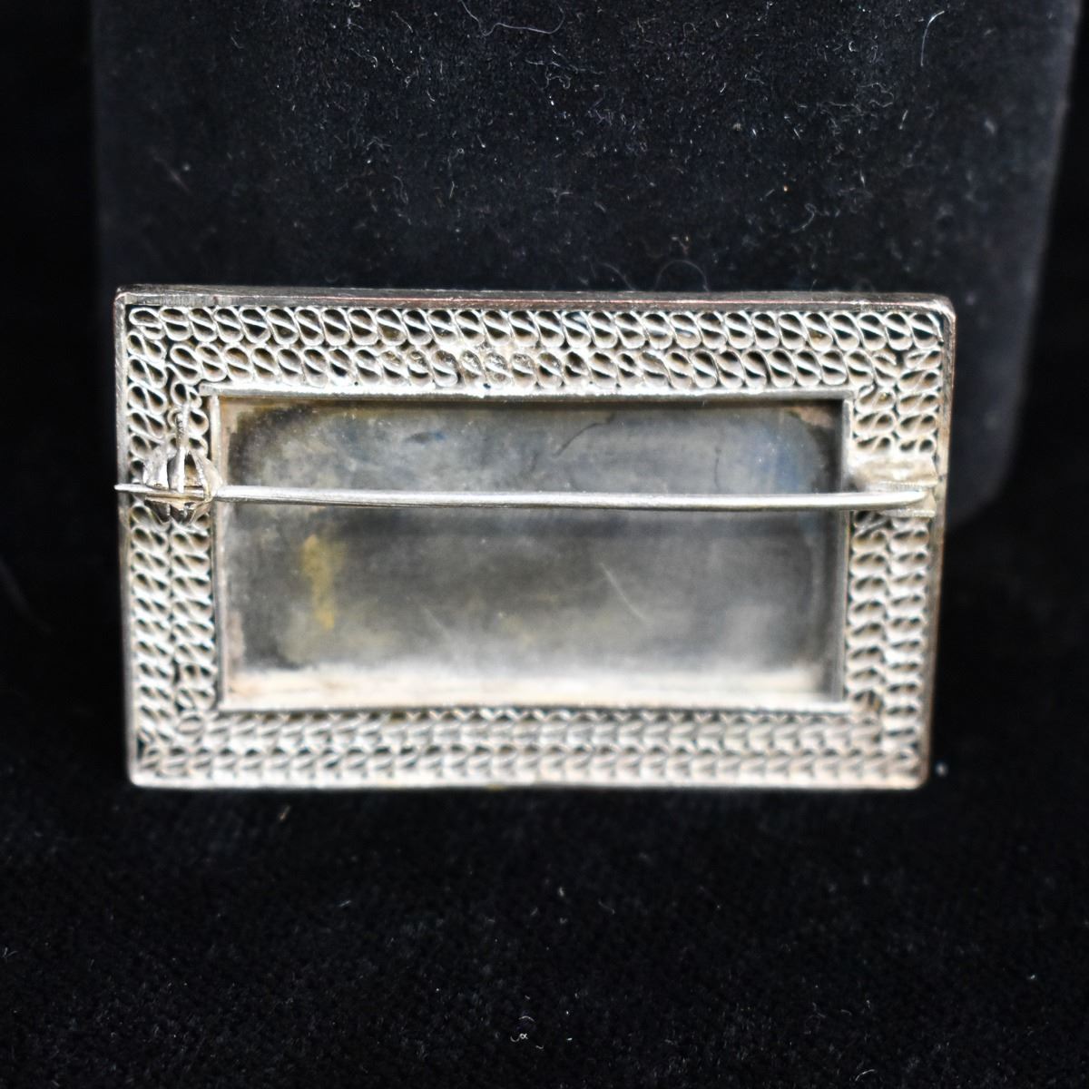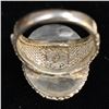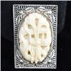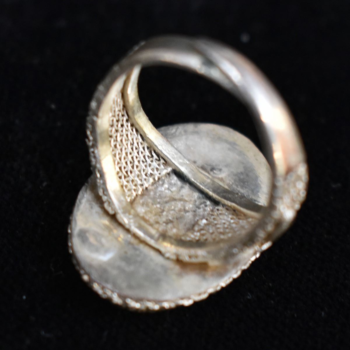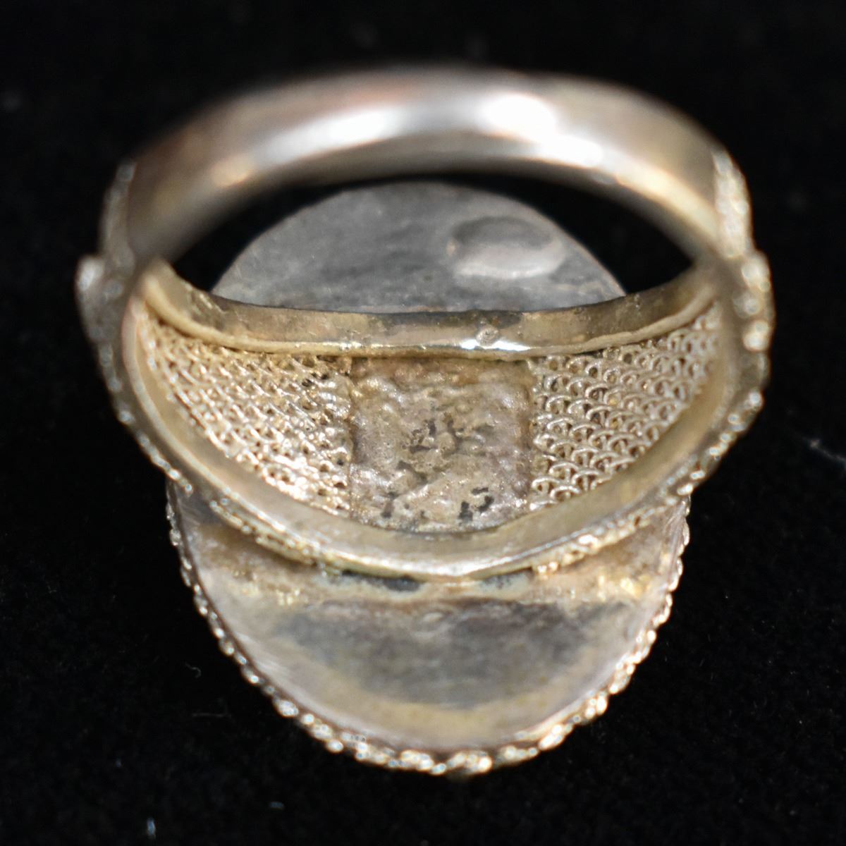Chinese Filigree Bracelet, Ring, and Pin, bracelet measures 7'' end to end x 1.5''W, ring size 7.75 and measures 7/8''L x .5''W, pin measures 1 5/8''L x 1'', unsure if the ovals are ivory or plastic, pieces are not sterling