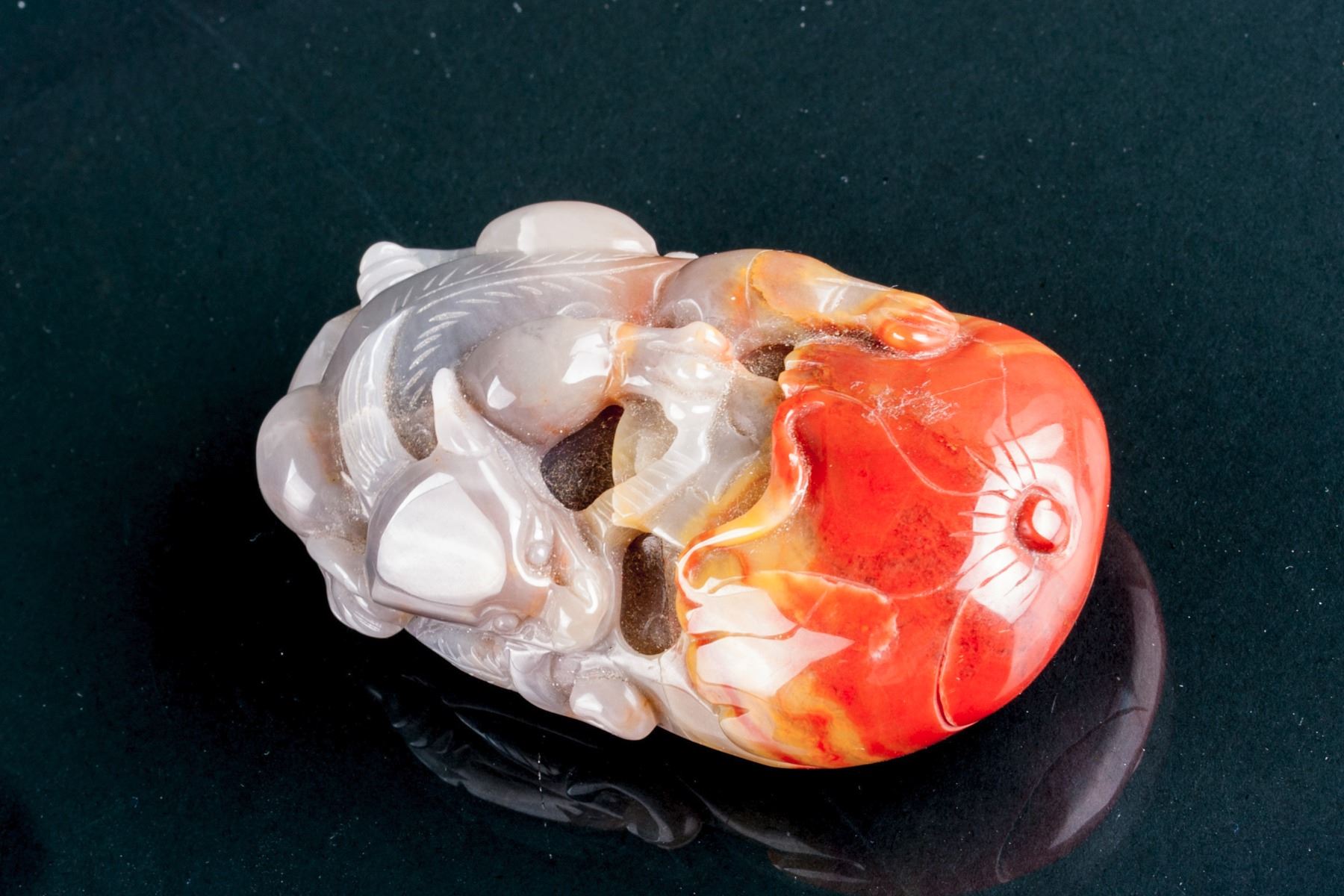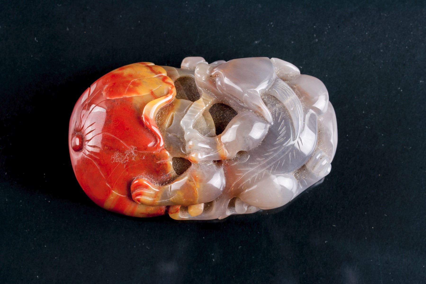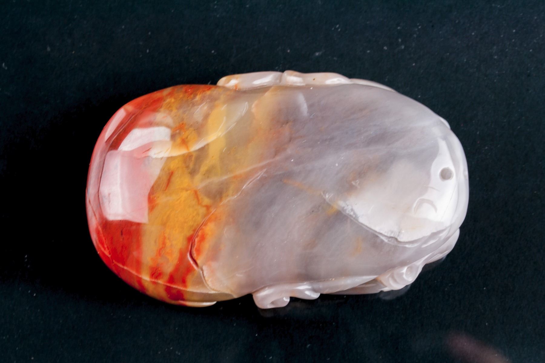 Chinese fine agate carved toggle; of pebble form; carved with dragon and lotus; pierced for suspension; 7.8 cm x 4.5 cm, 149 grams