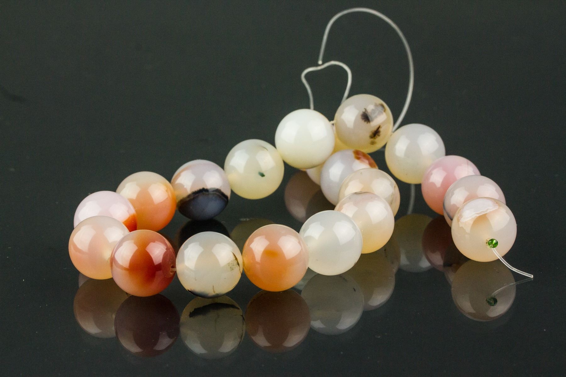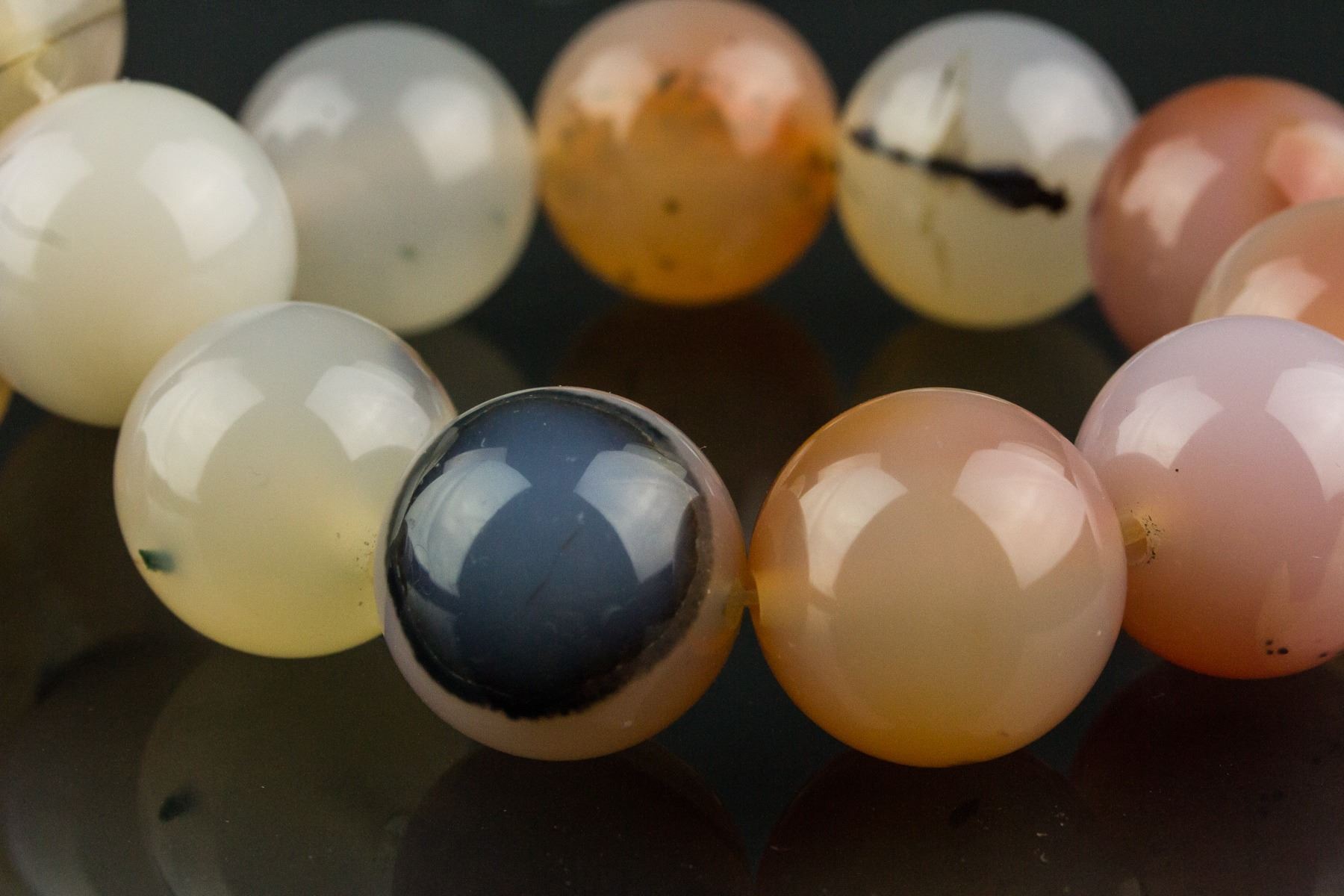 Chinese fine agate necklace; comprised of numerous rounded agate beads; the stone of mixed white, pink and dark brown tone; Bead D: 2 cm, 212 grams