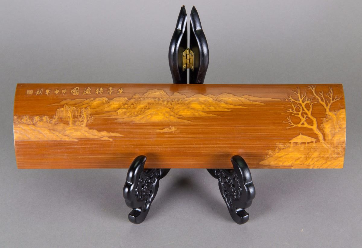 Chinese fine bamboo carved arm rest; featuring landscape carving; H: 8 cm, W: 30 cm, 165 grams