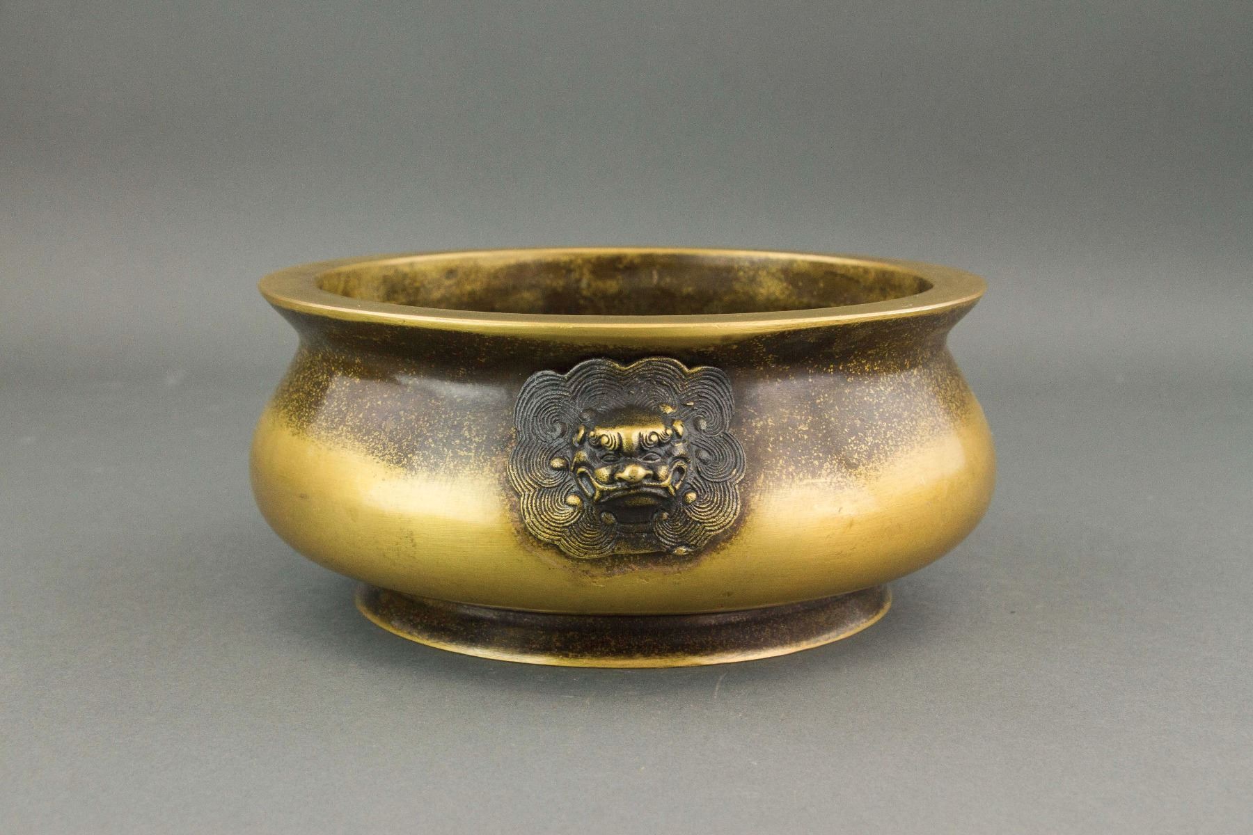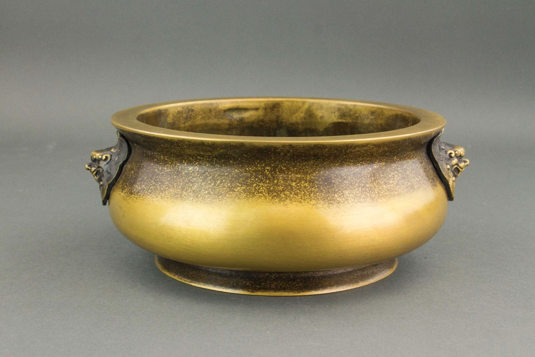 Chinese fine bronze censer; of compressed globular body with two lion head handles; four-character Qing Yu Wan Tang mark on base; H: 9 cm, D: 20 cm, 2452 grams