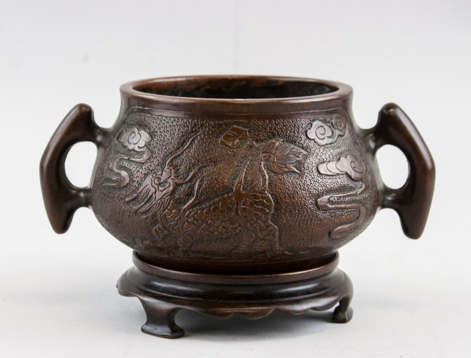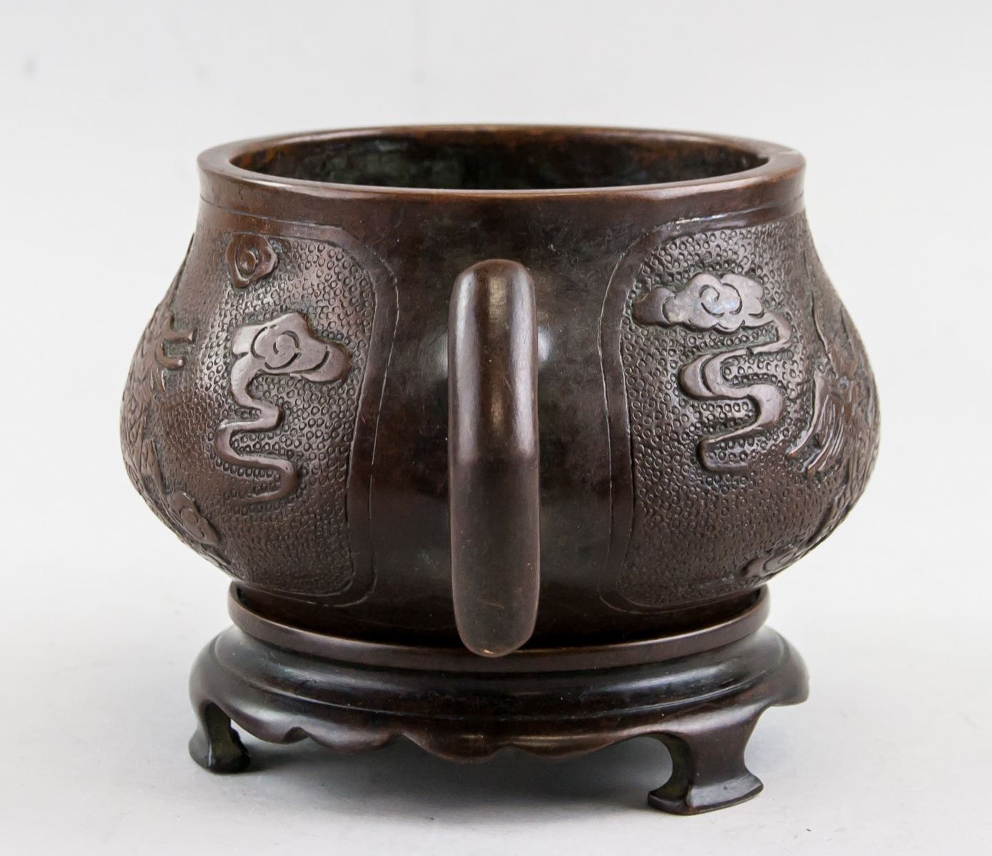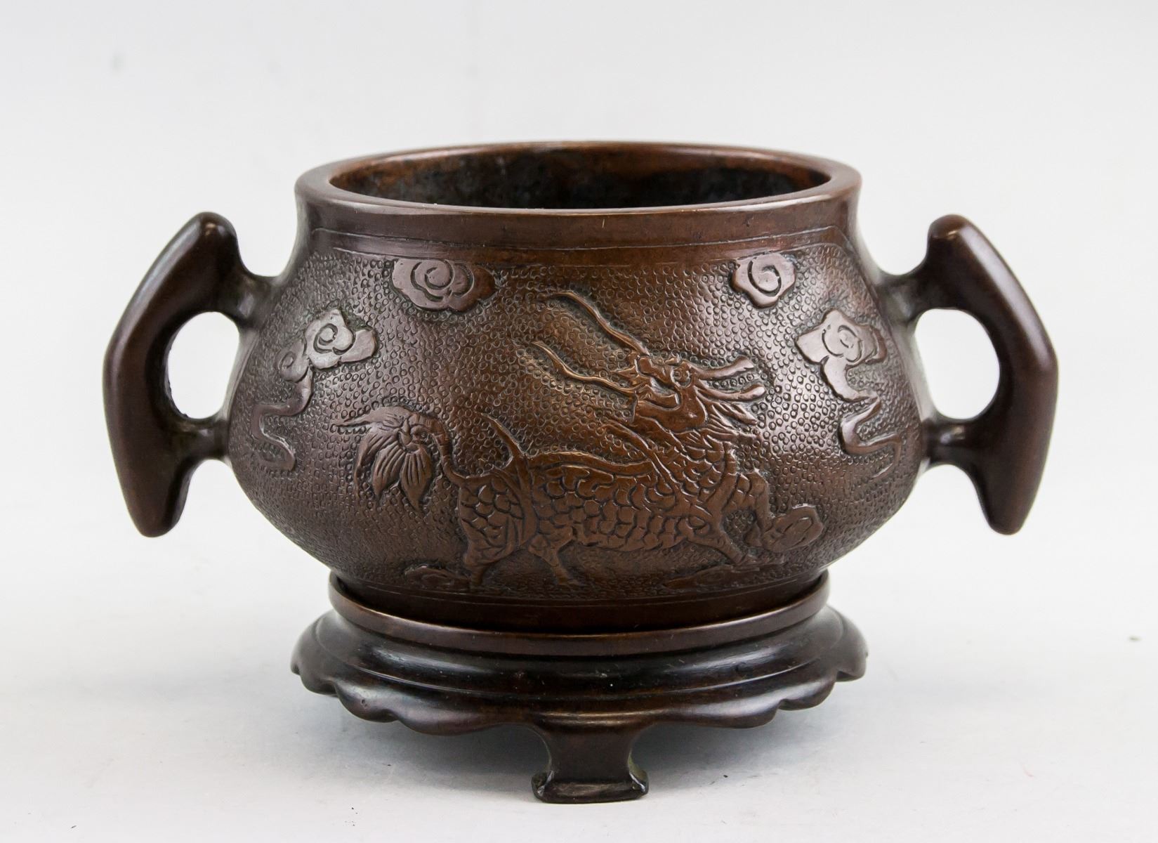 Chinese bronze cast censer. Of compressed globular body, flanked with two curved handles. Carved with dragons. Four-character Ming dynasty Xuande mark on base. With bronze stand. 12 x 20 cm, 2382 grams total