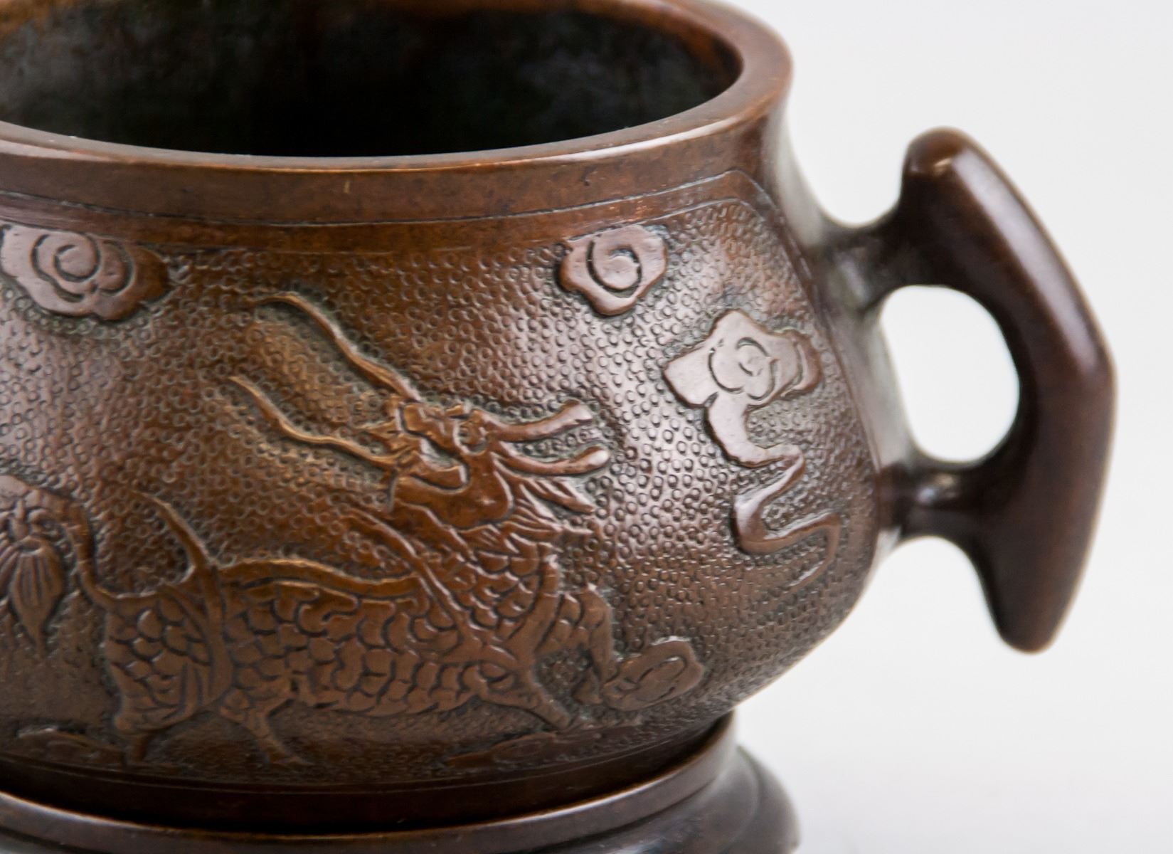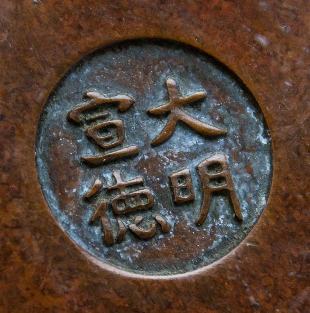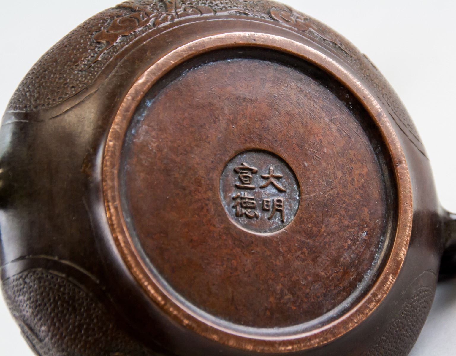 Chinese bronze cast censer. Of compressed globular body, flanked with two curved handles. Carved with dragons. Four-character Ming dynasty Xuande mark on base. With bronze stand. 12 x 20 cm, 2382 grams total