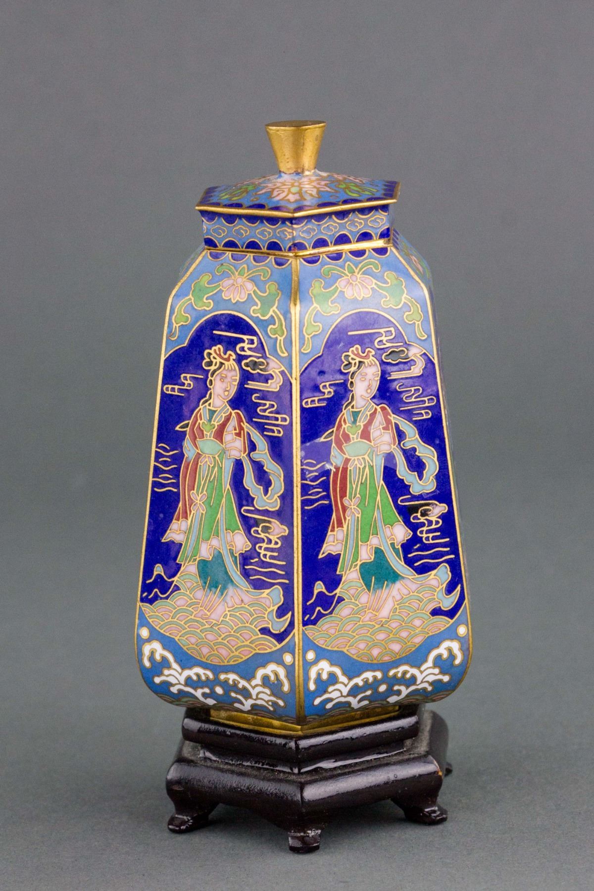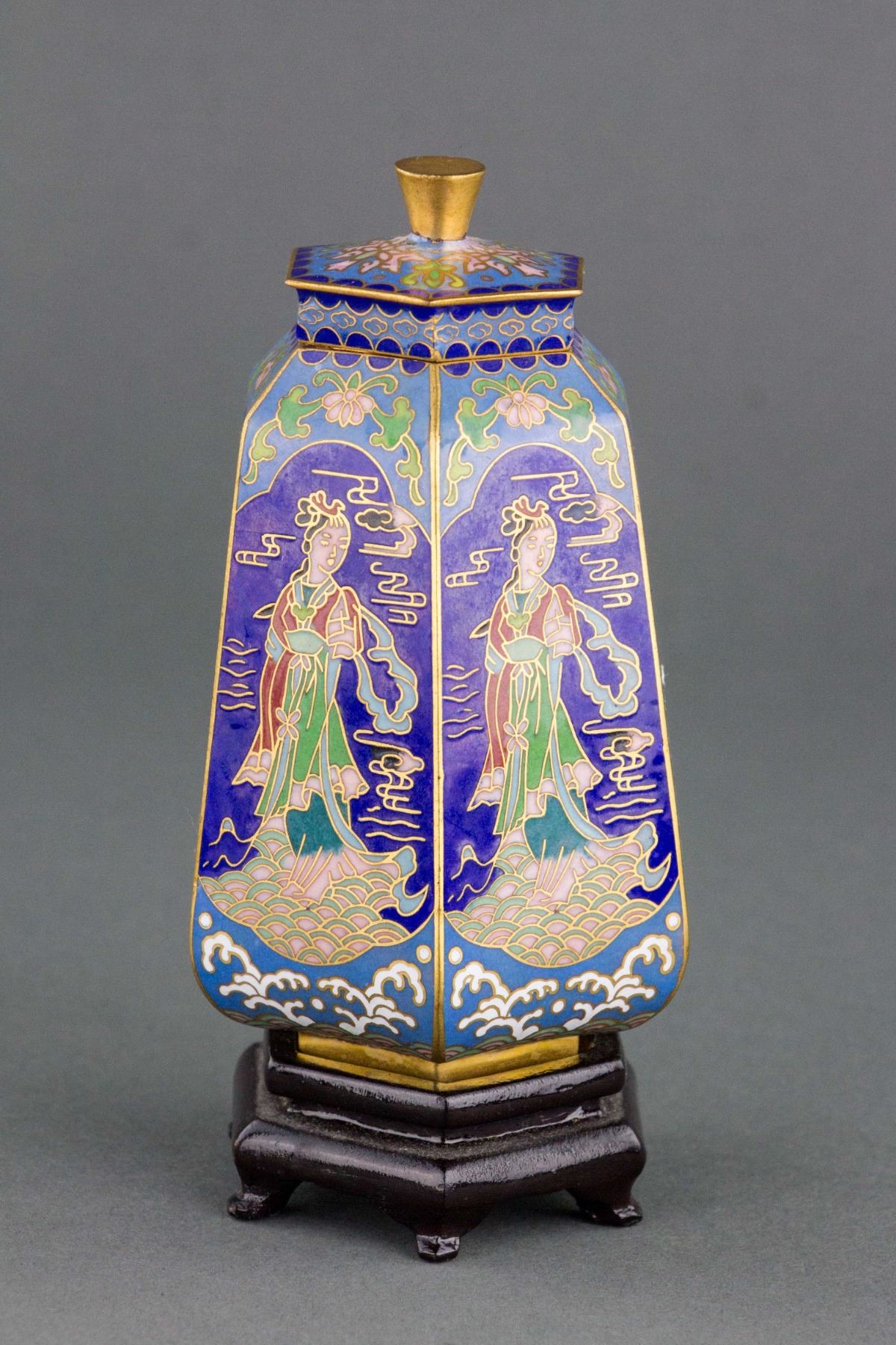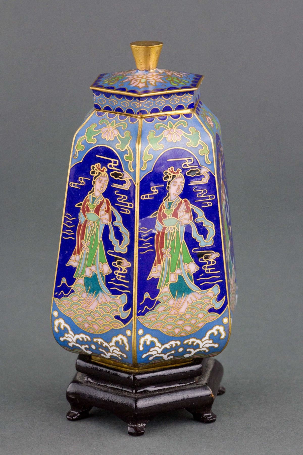 Chinese fine bronze cloisonne hexagon vase; of hexagon cylinder form, tapering to top; supported on short foot rim; with a cone knobbed cover; painted with immortals and decorated with floral pattern and wavy pattern; 14 cm x 7.5 cm, 277 grams