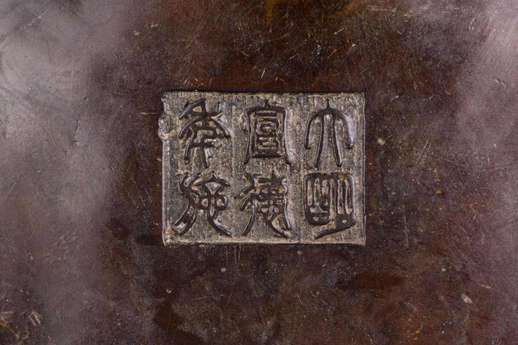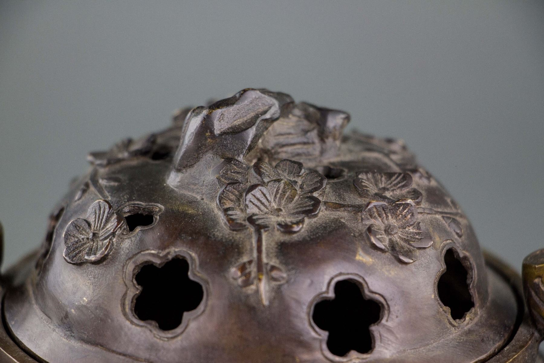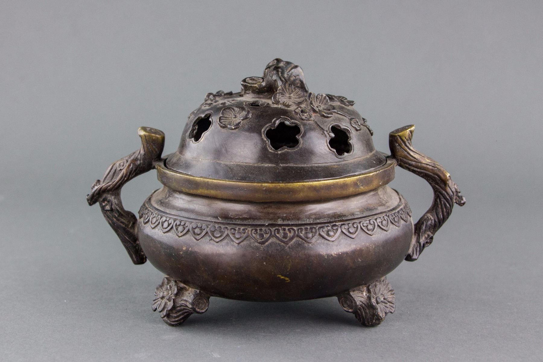 Chinese bronze censer; of compressed globular body; flanked with two tree branch form handles; supported on three flower form legs; cover with openwork carving of pedal form hole and flower form knob; six-character Xuande mark on base; 13 cm x 19 cm, 986 grams
