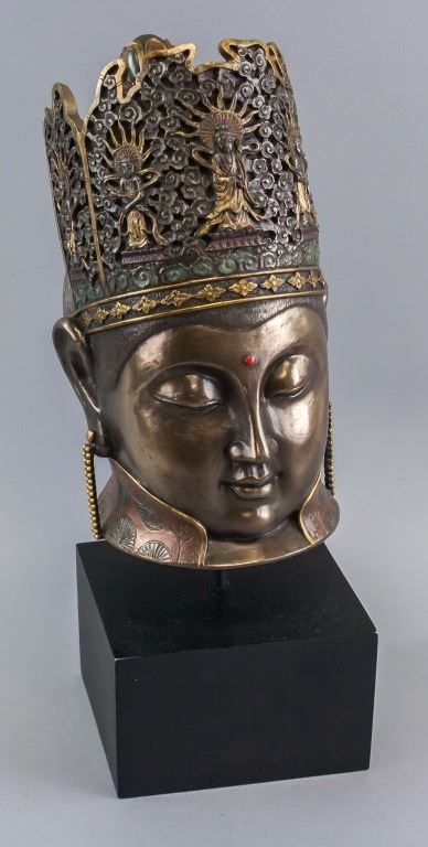 Chinese Buddha head. With crown of Buddhas and high collar. Accompanied with stand. Signature and date "2006" on crown. Slightly damaged. 34 x 13 cm. 4,187 grams.