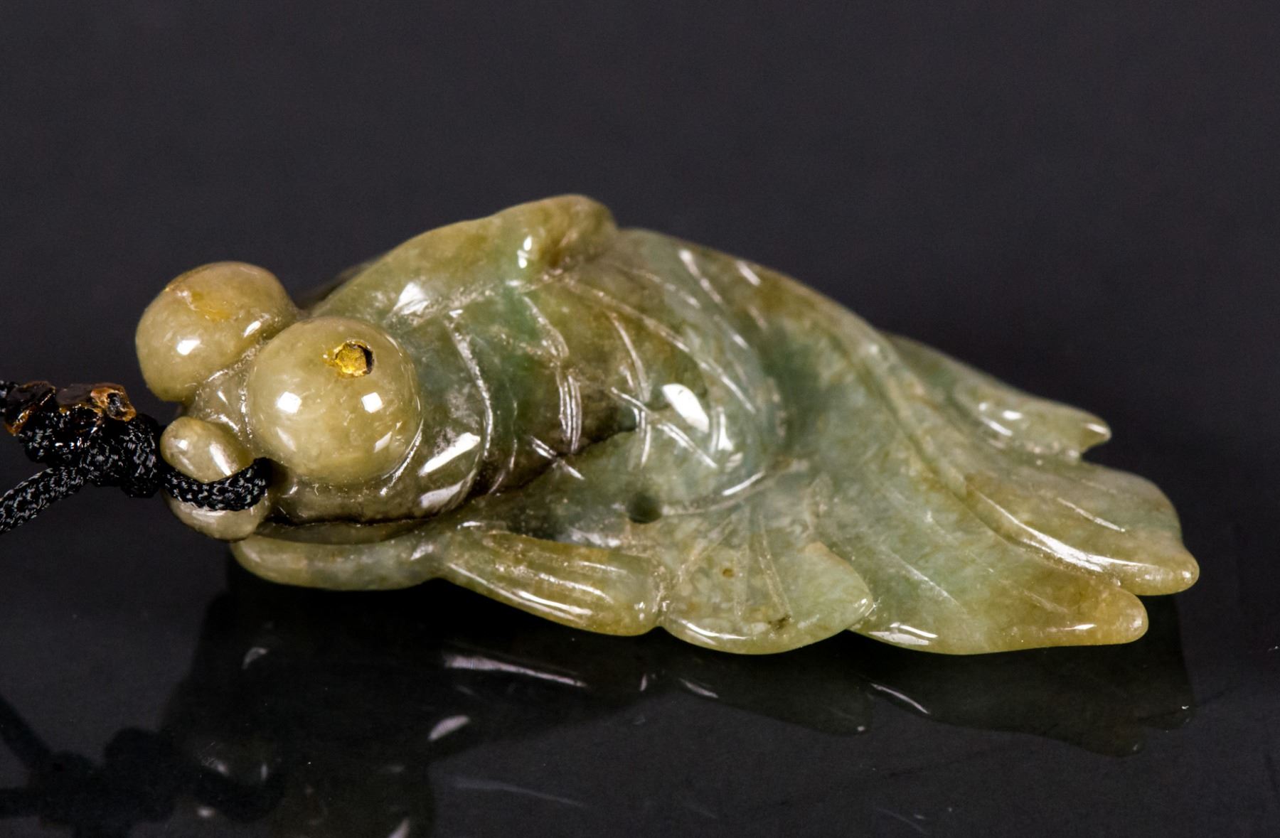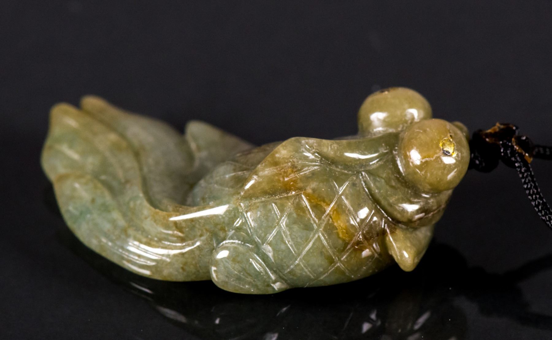 Chinese fine carved jadeite pendant; featuring gold fish; of spinach green tone; pierced for suspension; H: 4.5 cm, W: 2 cm, 10 grams; Density: 3.28