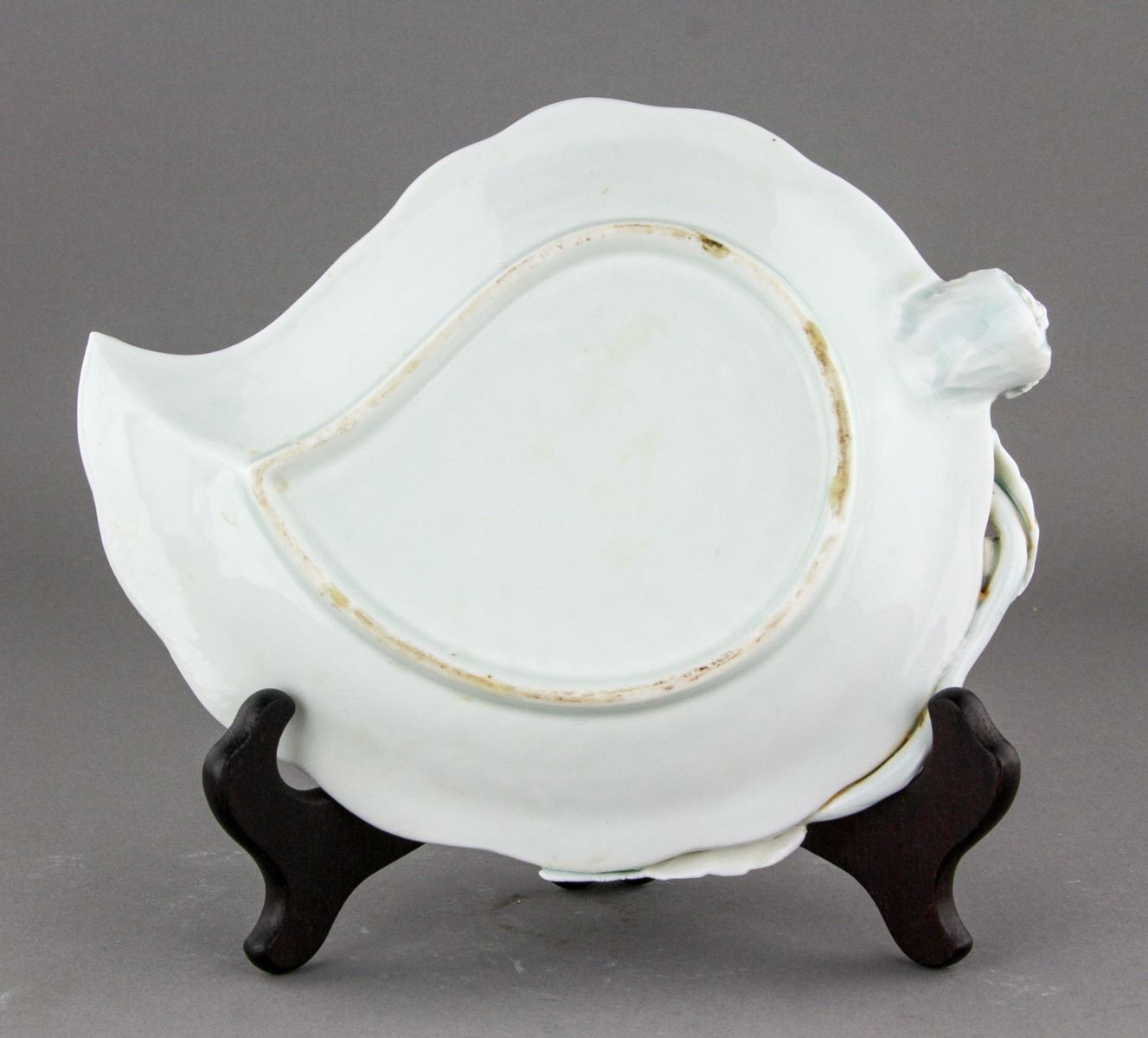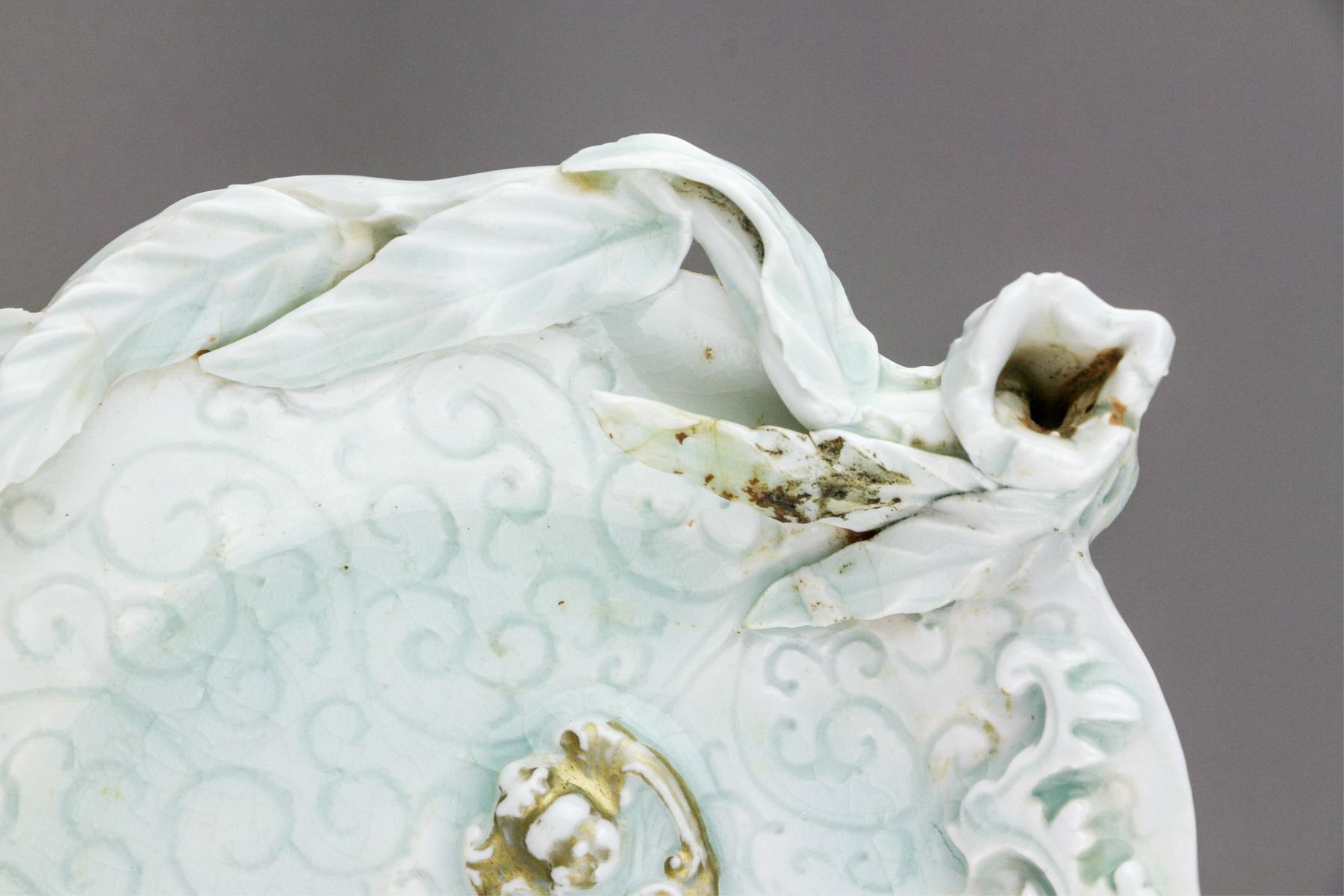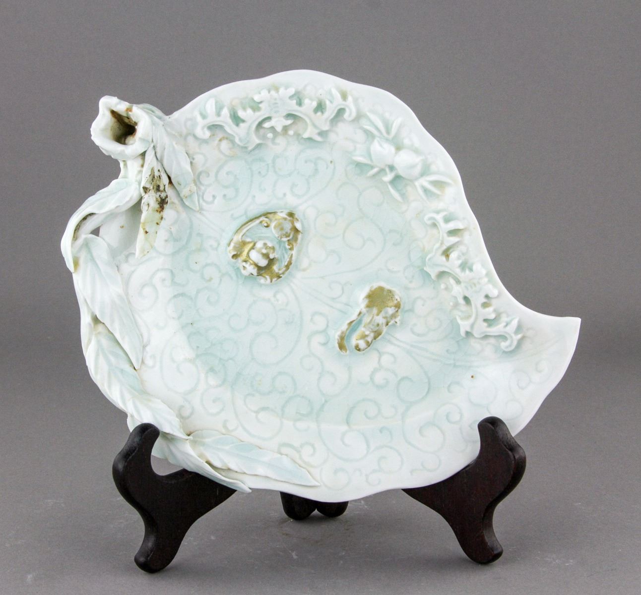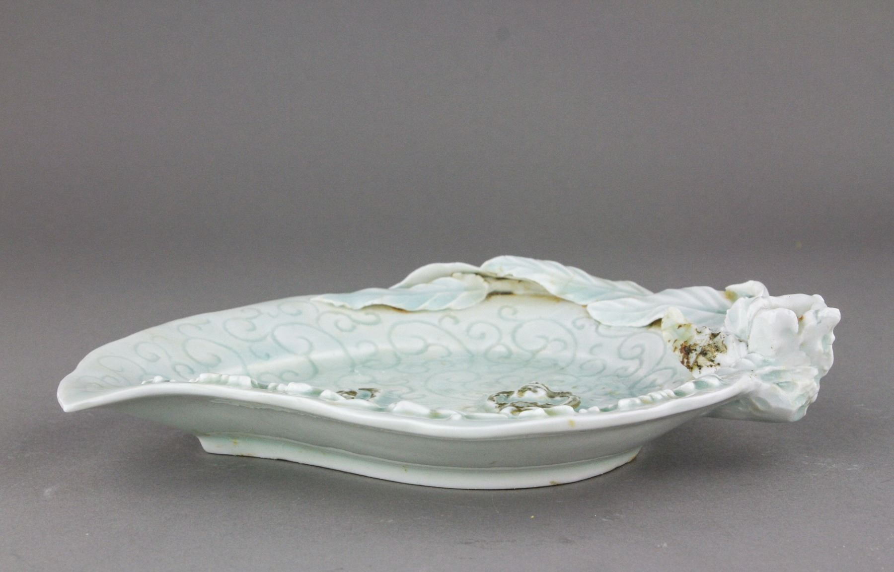Chinese fine gilt porcelain plate; of foliated rim with match-shaped foot ring; the body decorated with raised bats and peach branches; incised with scrollwork on light blue glazed ground; H: 4 cm, L: 22 cm, 480 grams